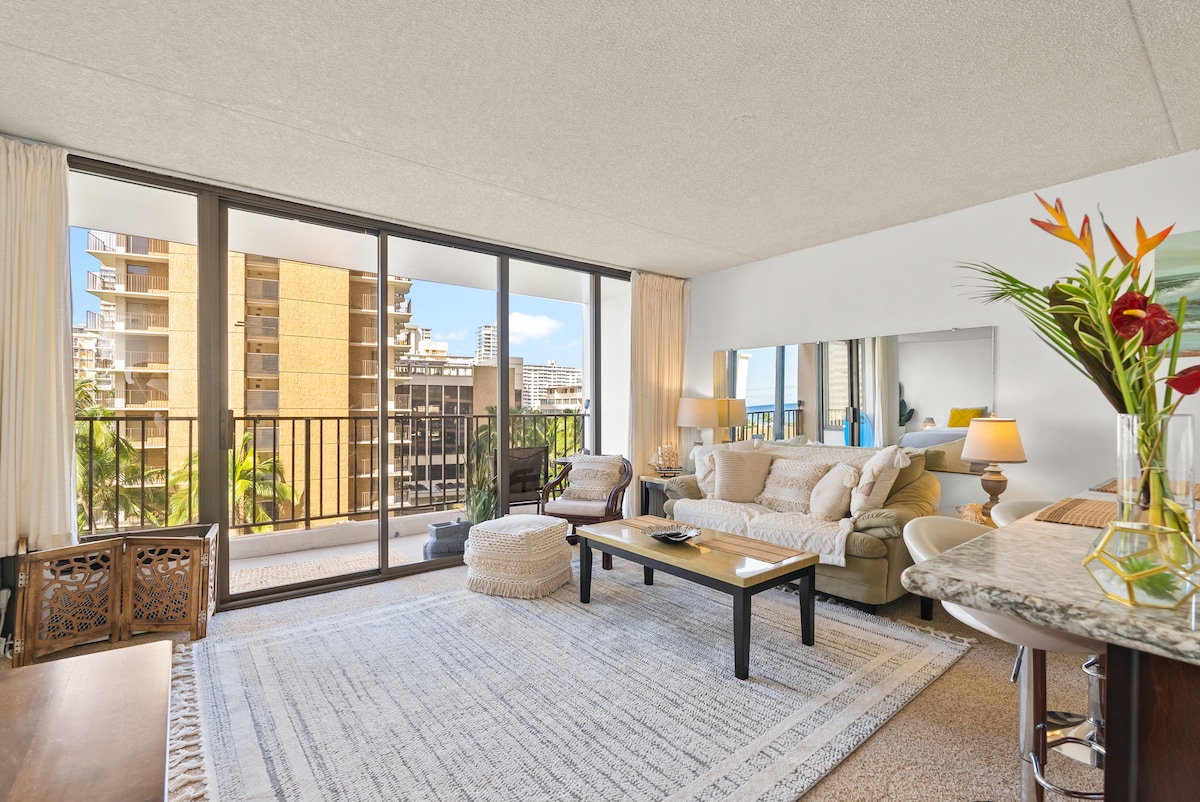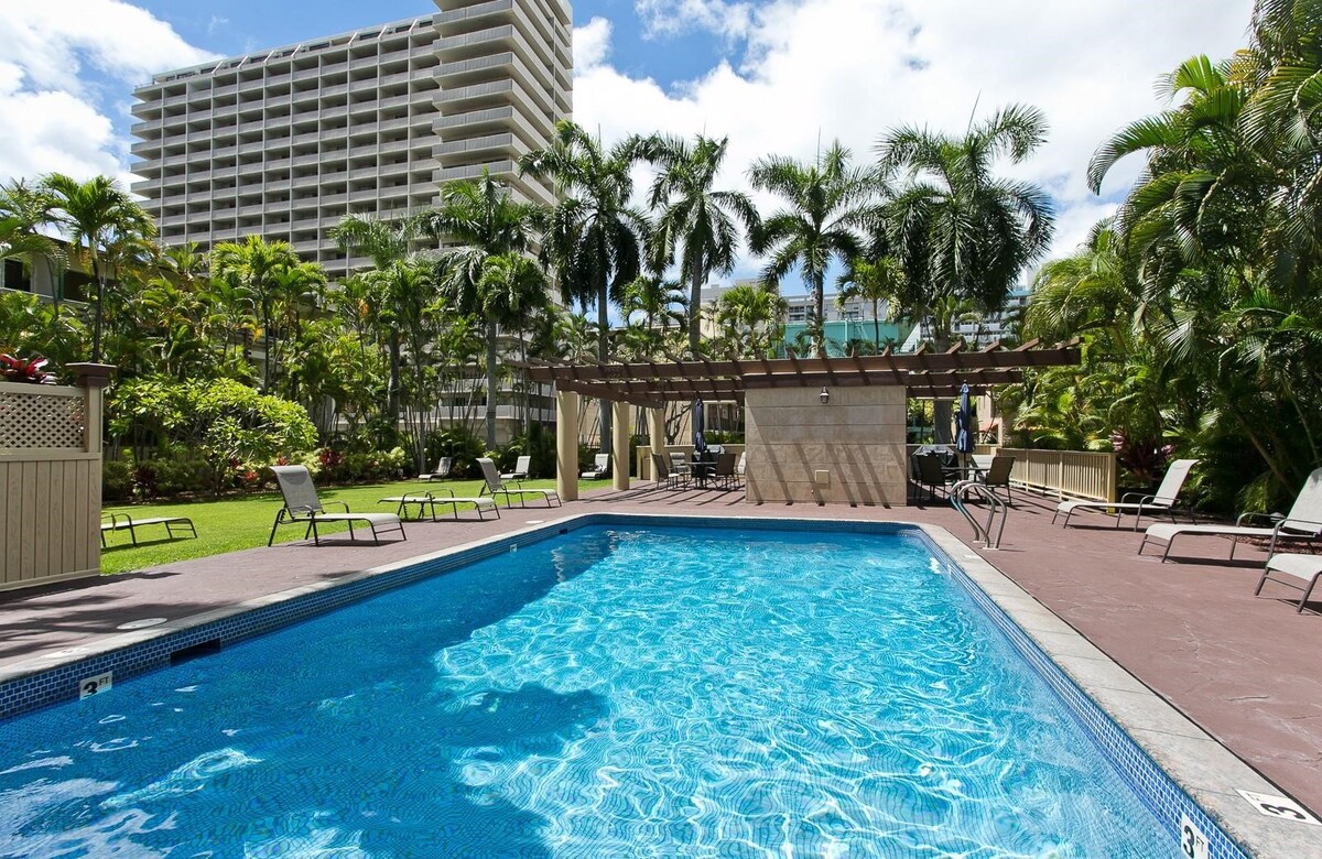 Located on the high floor of the Island Colony Condominium in the heart of Waikiki, this lovely studio features breathtaking ocean views, diamond heads and golf course views. This unit can accommodate up to 3 guests. The biggest advantage is that it is located in the center of Waikiki, a spacious lanai (balcony) where you can enjoy the sunshine and wonderful views in the morning, making it the best location to walk to beaches, shopping, and restaurants