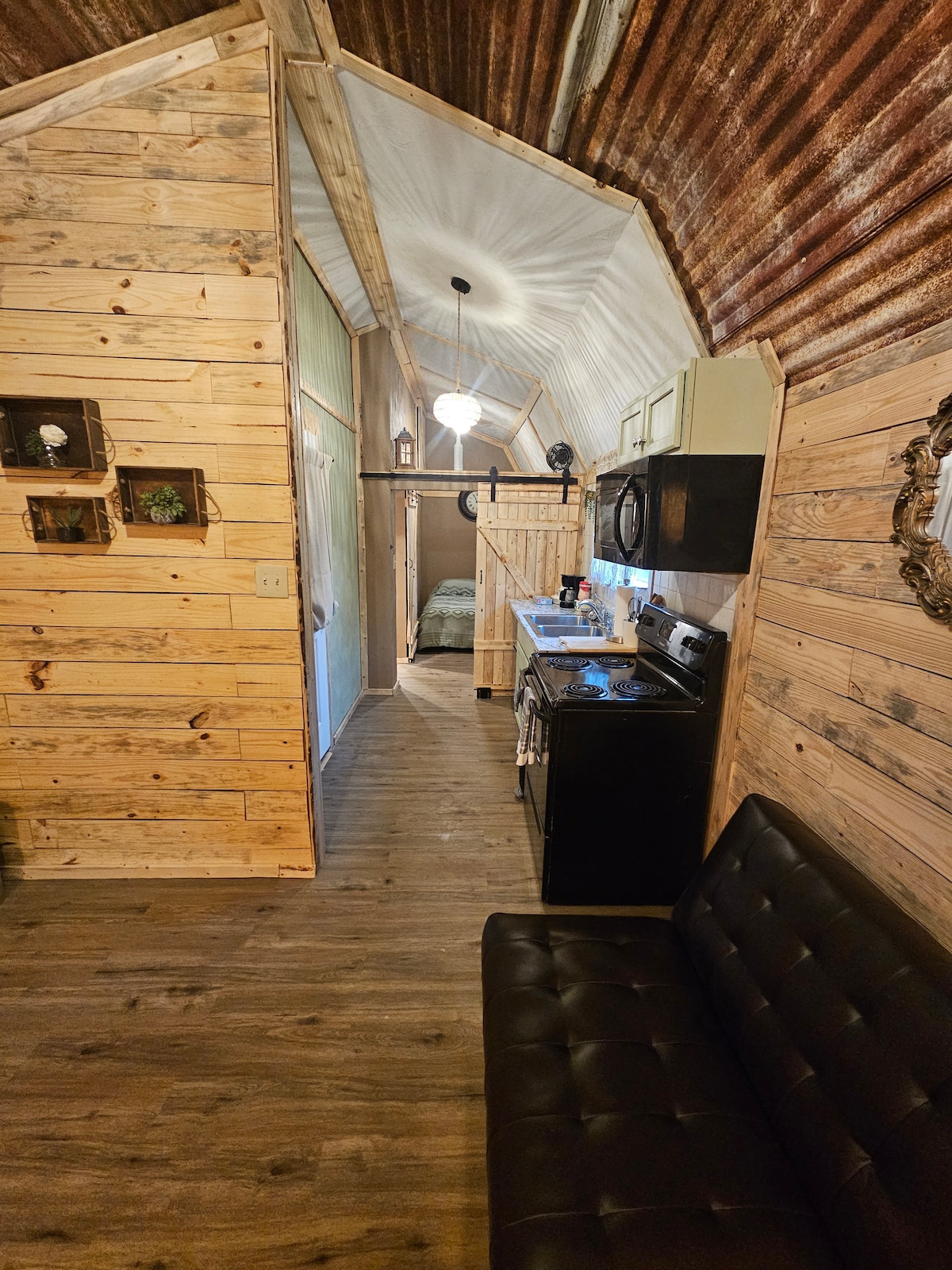 **NO CLEANING FEES!!** STORM SHELTER FOR BAD WEATHER** Affordable rustic tiny home Right off of I-30, very easy to find and within walking distance of a restaurant and a gas station! This is a new build that is constantly being expanded upon! Made in part of reclaimed materials from old buildings and with freshly milled wood, grown locally. Heavy discounts for weekly and monthly stays!