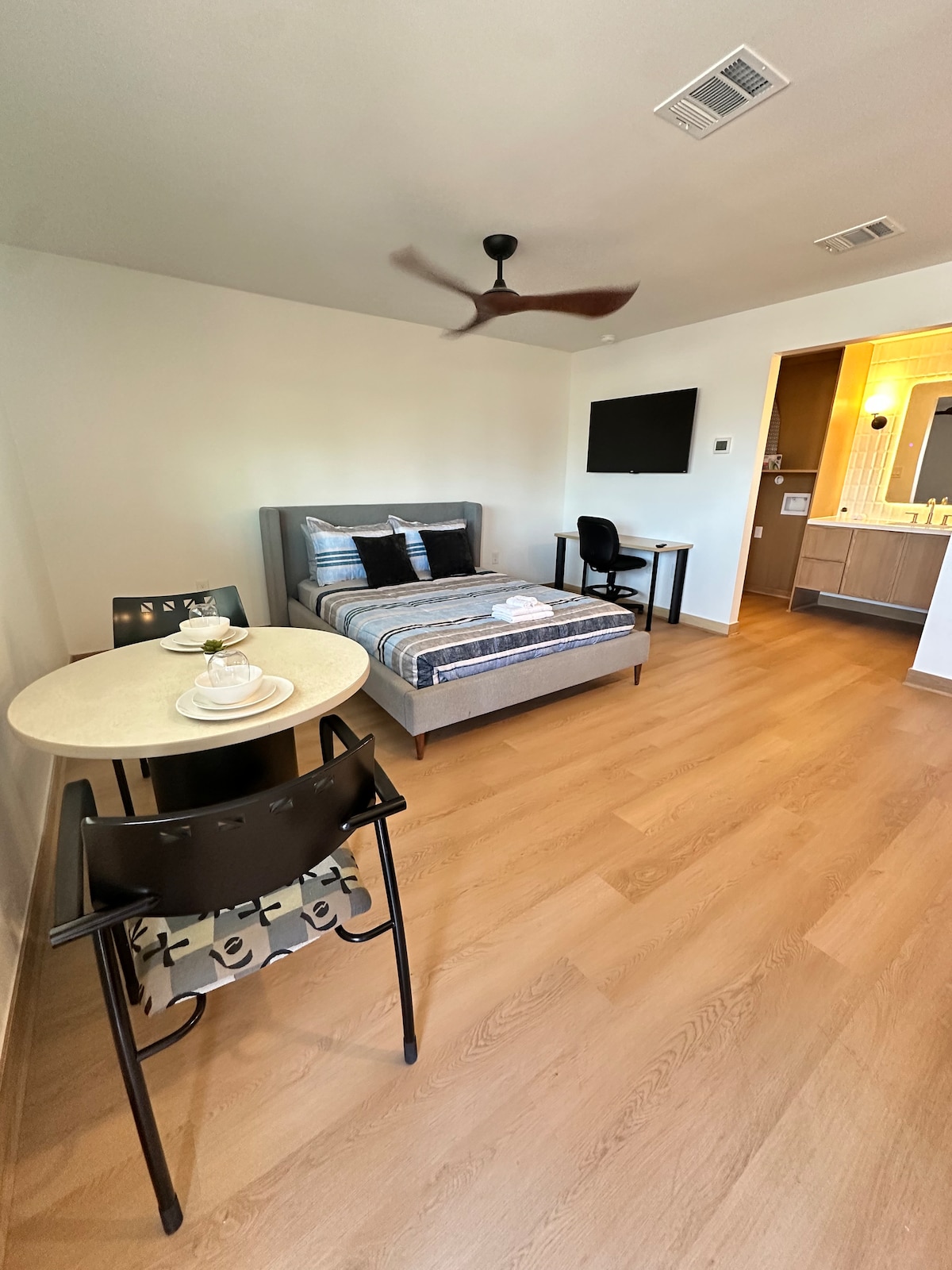 Tranquil top floor studio with skyline views in a prime central location. Bright, quiet, and intentionally designed for rest and ease. Wake up to sunrise from the king bed and unwind in a calm, elevated space above the city. With over 300 stays, guests consistently mention the comfort, cleanliness, and how relaxed they feel here. Thoughtful hosting and a smooth, reliable stay. Secure parking included, with easy access to Downtown and the Heights.