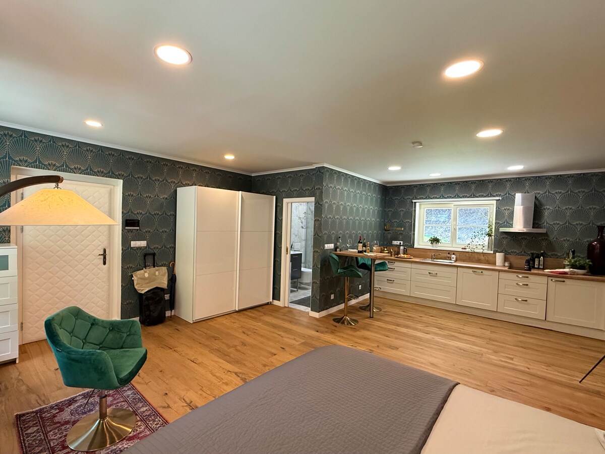 Escape to a tastefully renovated historical cabin. Warm up in the wood-fired sauna, then cool off in a natural pond. Enjoy the sound of the waterfall, forest, and nature all around. Relax by the window with a crackling fire. Luxury comforts include a Bowers & Wilkins sound system, a fully equipped kitchen upcycled from old wooden doors, and a bathroom with heated floors and a rain shower. Perfect for a romantic stay or remote work with a pull-out Dell monitor. Just 30 minutes from Prague.