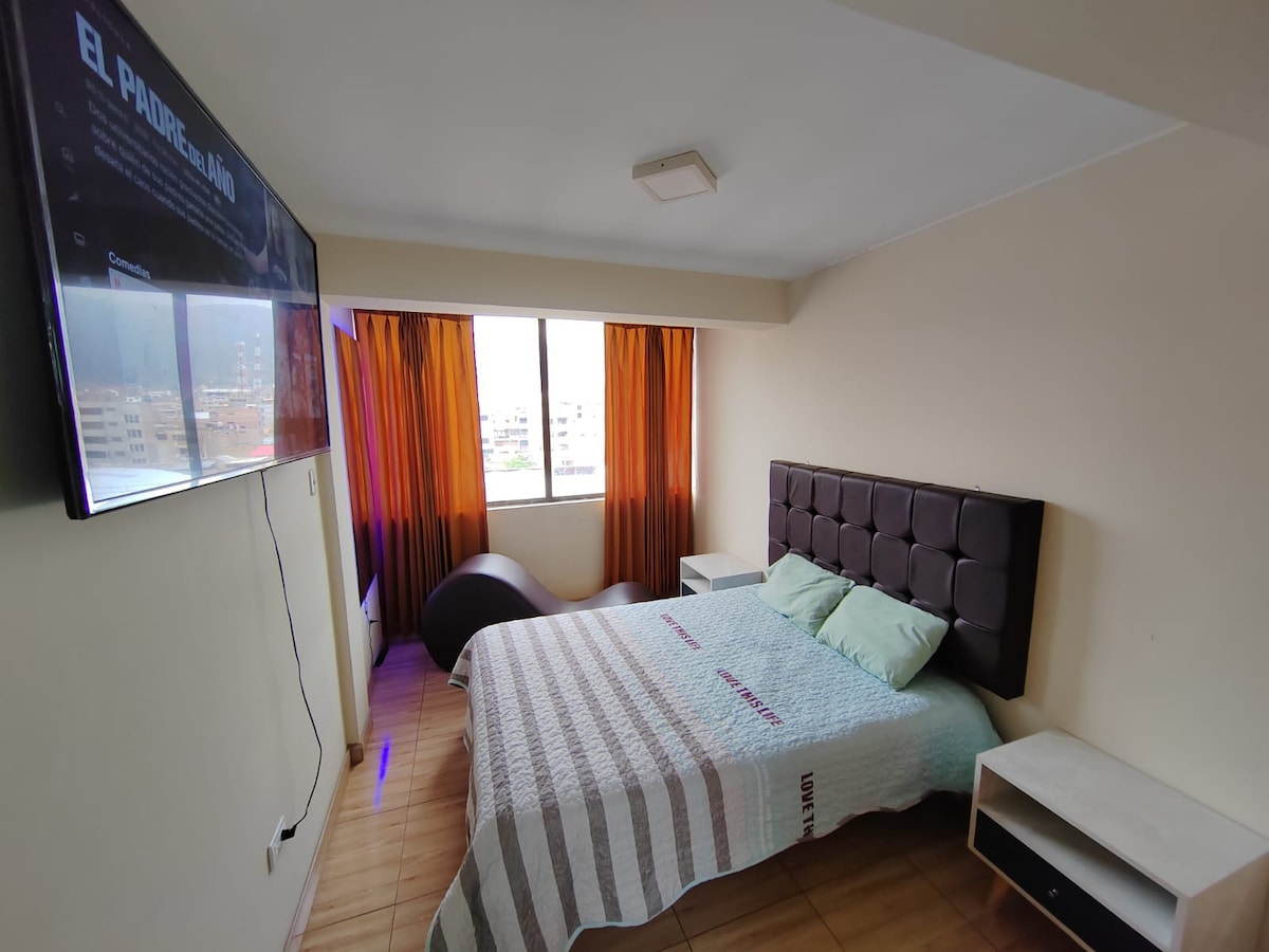 Habitación acogedora en el corazón de Huancayo a 5 min de la plaza de armas. Amplia, ventilada y buena iluminación con vista a la calle, cuenta con cama cómoda, baño privado, smartTV, internet WI-FI, microondas, hervidora y utensilios. Área de lavandería y cocinita compartida para preparar comidas. Ubicación céntrica, cerca de restaurantes, parques y tiendas. Huancayo es una ciudad rica con cultura e historia con mucho que ver y hacer. Estamos aquí para que tu estancia sea lo más cómoda posible.