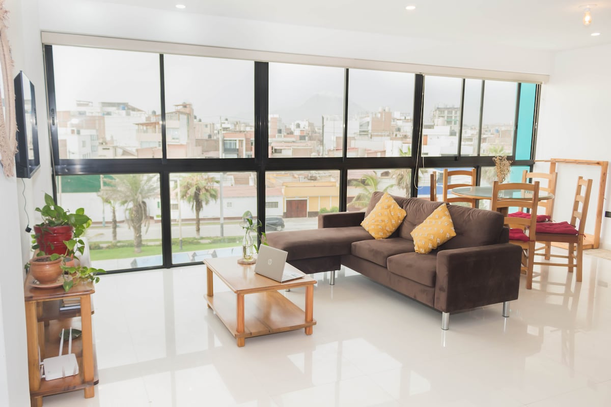 Lindo departamento con vista al mar, en la hermosa y turística playa de Huanchaco, a 50m del mar, suave decoracion playera y ambientes amplios, estamos en zona residencial tranquila , para disfrutarlo al máximo de sus aguas, sol, arena, caminatas, surfismo, pesca y admirar diariamente un sunset espectacular, cerca de lugares turísticos como su bello muelle, museo marino, de los ancestrales caballitos de totora., restaurantes y mercado.