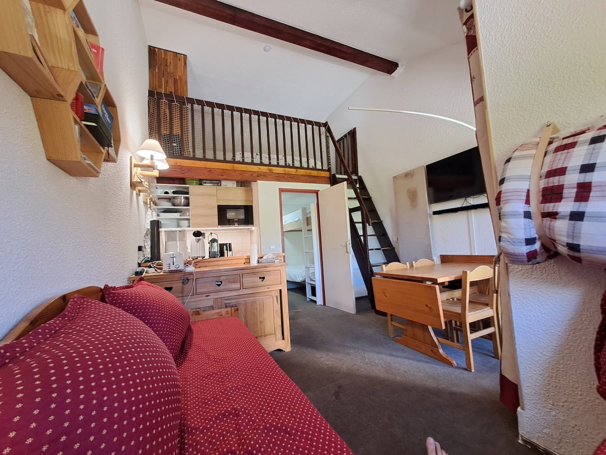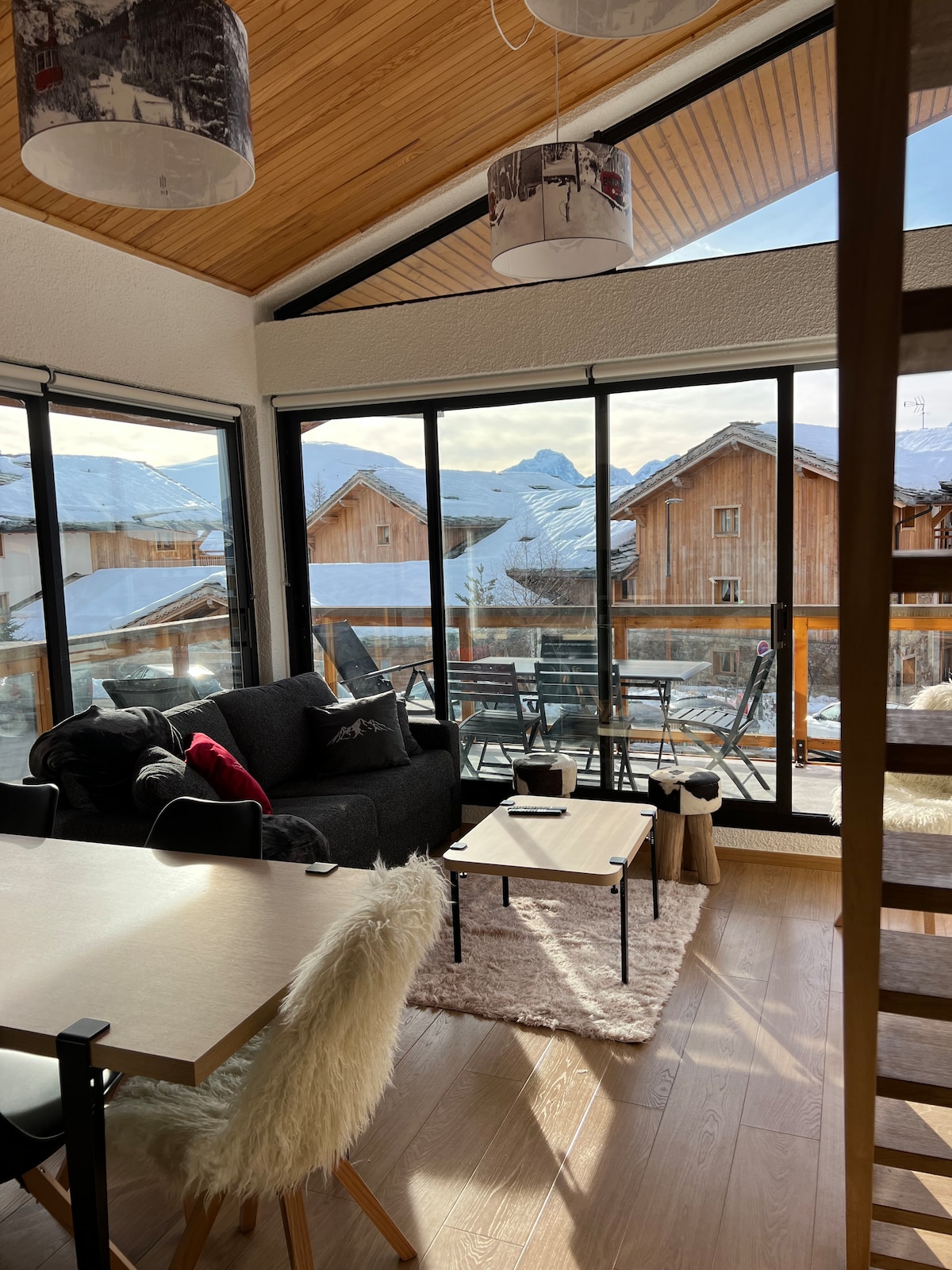 Rented in the centre of Alpe d'Huez flat of 33m² + 7 m² balcony facing south, completely renovated in the mountain style (summer 2021). It is south facing with a view of the Oisans massif. The sleeping arrangements are for 6 people (1 double bed and 2 single beds in the mountain/mezzanine area and a sofa bed of 140cm in the living area). All beds are equipped with duvets. The flat is very close to the shops and is very well equipped. Ski in/ski out.
