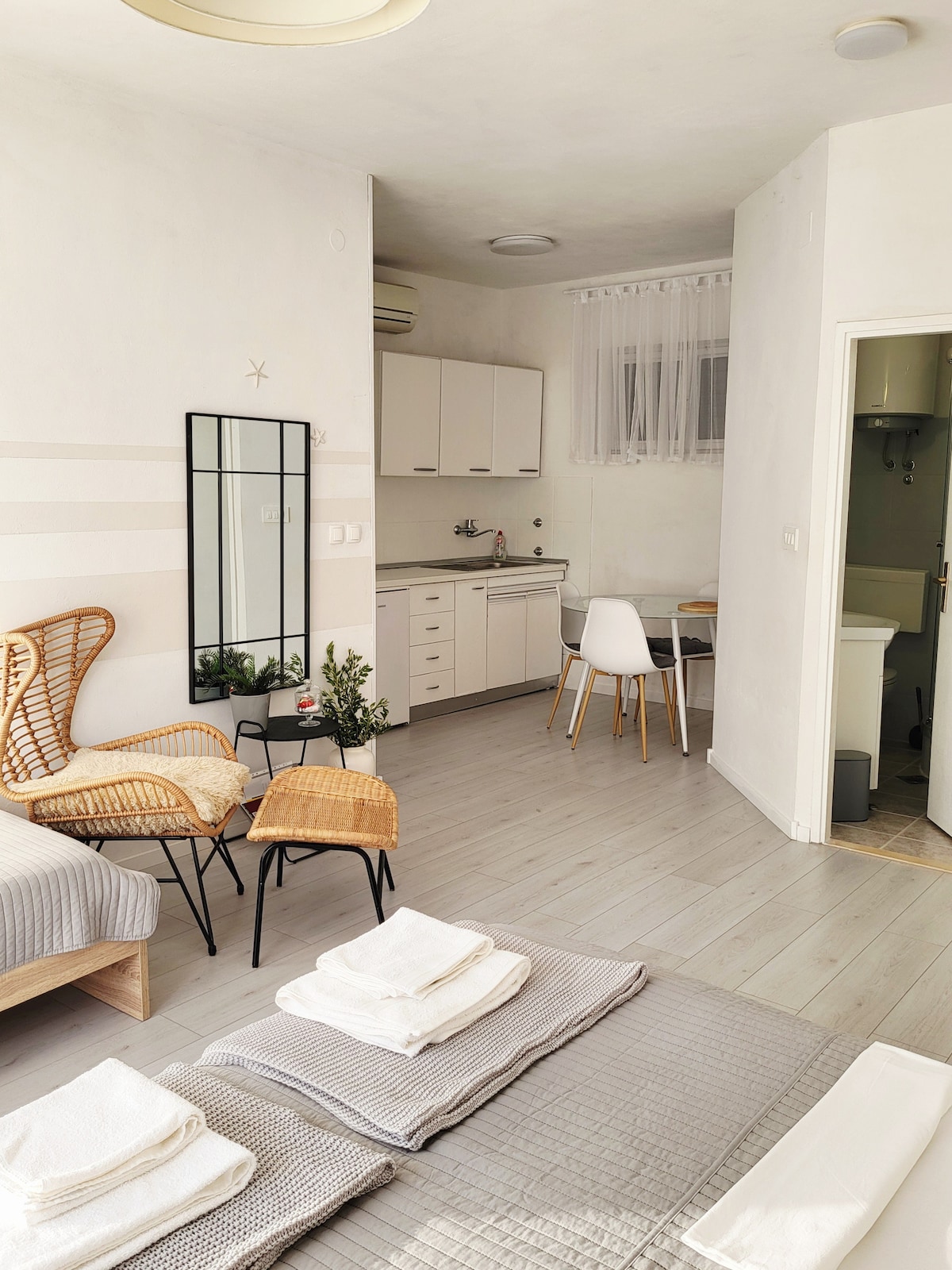 60m 2 mənzil 180-22 sm-lik ikinəfərlik çarpayısı olan yataq otağından, vanna otağından, mətbəx, foye və balkonu olan geniş qonaq otağından ibarətdir. Məkanın parlaq olması və balkon ilə əhatələnmiş şüşə şüşəli dənizlə qarşı-qarşıya dayanan bütöv cənub divarı. Mənzil evin üçüncü mərtəbəsində, şəhər mərkəzinə çox yaxın yerdə yerləşir (dəniz kənarında 5 dəqiqəlik xoş gəzinti) və evin dəniz və adalara açıq mənzərəsi olan balkonu var, çünki ev dəniz kənarında ilk cərgədə yerləşir.