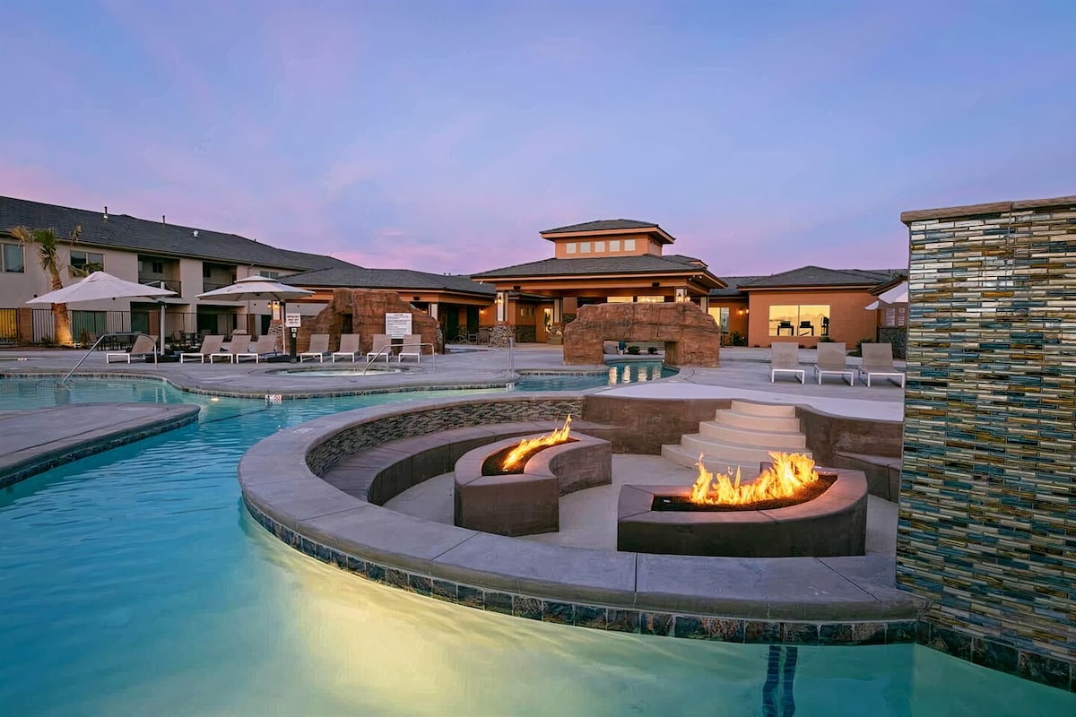 Brend Yeni şəhərcik Sionun Milli Parkına 36 mil məsafədə yerləşir və açıq havada ayrıca cakuzi, od çuxuru və qızdırılan hovuz var. Sakit Vida Sol icması I-15-dən cəmi 2 dəqiqə, St George çıxış mağazalarına və Walmart/Costco-ya isə 5 dəqiqə məsafədə yerləşir. Yaxınlıqda dağ velosipedi, gəzinti yolları və iki park. ✓Ayrıca cakuzi 🏊İstilikli Hovuz (Paylaşılan, il boyu istiliklə təmin edilir) 🛏️3YATAQ OTAĞI/3HAMAM 🛋️2 Qonaq Otağı 👨🍳 Baş aşpazın mətbəxi 📶Sürətli/Pulsuz internet 📺Ağıllı TV-lər ❄️Kondisioner 🔥Od çuxuru 🍖Qril 🛀Böyük vannası
