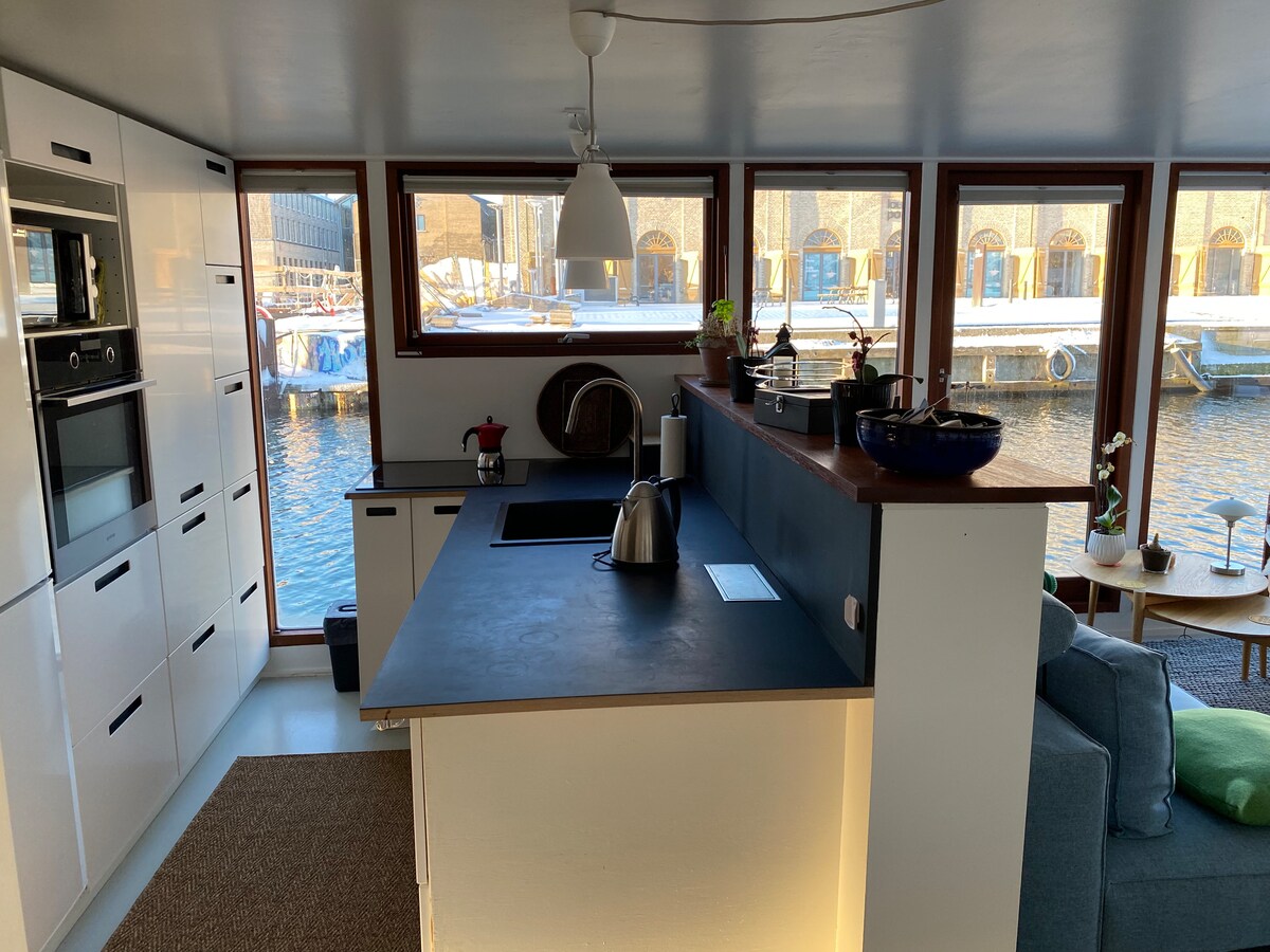 Welcome to our charming houseboat Cocoon in Copenhagen. You will have 55 square meters of floating residence full of "hygge" as well as a terrace. The boat is located on the island Holmen, next to Operaen - walking distance to the city centre, Christiania, and Reff'en. There is a grocery store within 5 min by foot. The airport is 15 minutes away by taxi. The boat has a living room with a sofa bed and a mezzanine bed, a kitchen, a separate bed room, an office, and a bath room with shower
