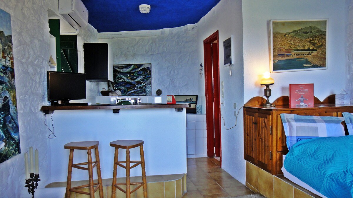 The 35 m² apartment on the first-floor with its own entrance was completely renovated recently. It has easy access without steps, as it is right on the harbor, next to the bakery, the cafes,the restaurants, the banks and the main market of the island. It can accommodate up to 2 people. Rooms: Separate bedroom with double bed and balcony facing the harbor of the island, fully equipped kitchen and bathroom.