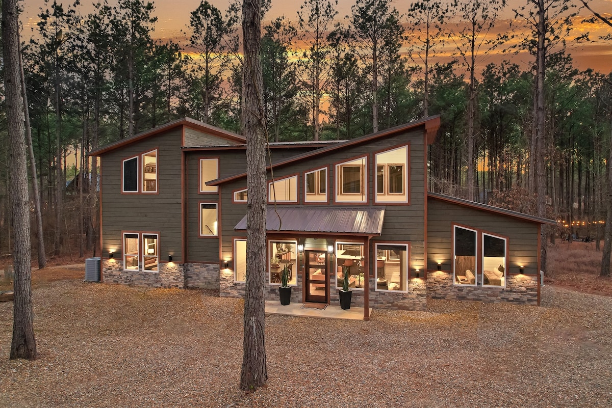 * Hot Tub * Swinging Daybed * Fire Pit * Swing Garden * Treetop Deck * EV Charger Escape to a modern romantic cabin near Beavers Bend State Park and Broken Bow Lake. This secluded gem offers a serene retreat amidst lush woods. Relax on the elevated treetop-style patio, complete with a custom swinging daybed. Enjoy the swing garden next to the outdoor fire pit, where swinging egg chairs invite cozy evenings by the fire.