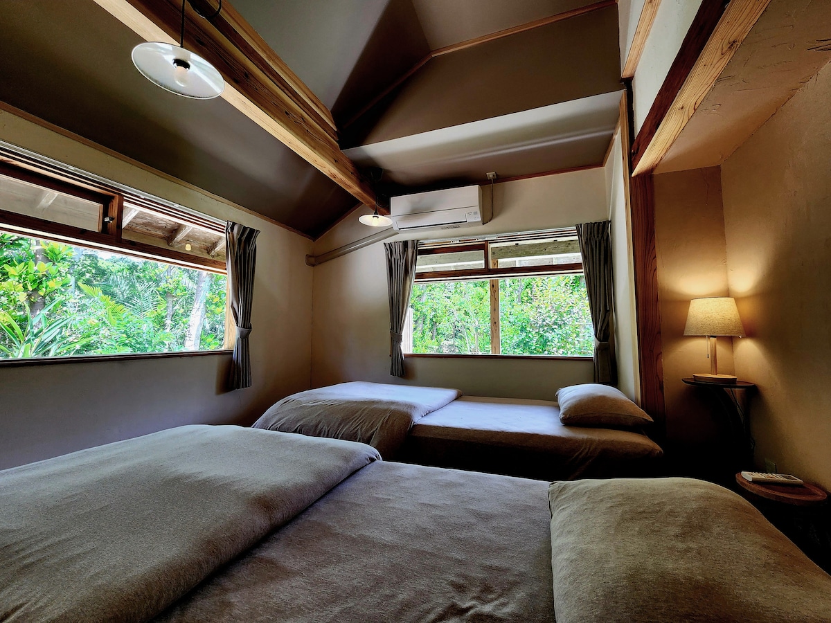 静けさがゆっくりと満ちていく、リノベーションされた沖縄古民家。 余計なものをそぎ落とした空間には、 風の音、木々の揺らぎ、光の移ろい―― ただ “今” を味わうための色彩だけが残っています。 畳に身をゆだね、深く息を吸うと、 心の輪郭がすこしずつやわらいでいくのを感じるでしょう。 窓辺の緑は、まるで庭に置かれた“一幅の絵”のように、 静かにあなたの内側へ語りかけます。 美ら海水族館まで車で約5分。 北部観光の拠点でありながら、 ここは旅の喧騒から一歩退き、 **“あるがまま” に戻るための小さな庵(いおり)**でもあります。 ■ ご案内 ・当施設では調味料のご用意がございません。ご了承ください。 ・自然の中の一軒家ですので、どうしても虫は出現します。ヤモリ、蜘蛛、アリなどの虫が苦手な方はご予約をお控えください。