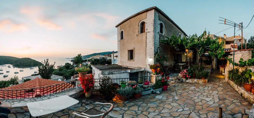 Adanın ən dar hissəsində yerləşən Perivoli kəndindəyik. Tavernalar, alış-veriş və Korfu şəhərinə gedən avtobus piyada 5 dəqiqəlik məsafədədir. Balıqçılıq kəndləri ilə şərq tərəfə cəmi 2 km, qərb sahilinə isə 3 km məsafədə qumlu çimərliklər var. Onun qonaqlama yeri bizi bağça ilə əlaqələndirən ayrı bir evdə sakitdir. Bunu hər biri 2 tısbağa, pişik və sevimli it ilə paylaşırsınız. Buradan materikdəki dağlarda günəşin doğduğunu görə bilərsiniz.