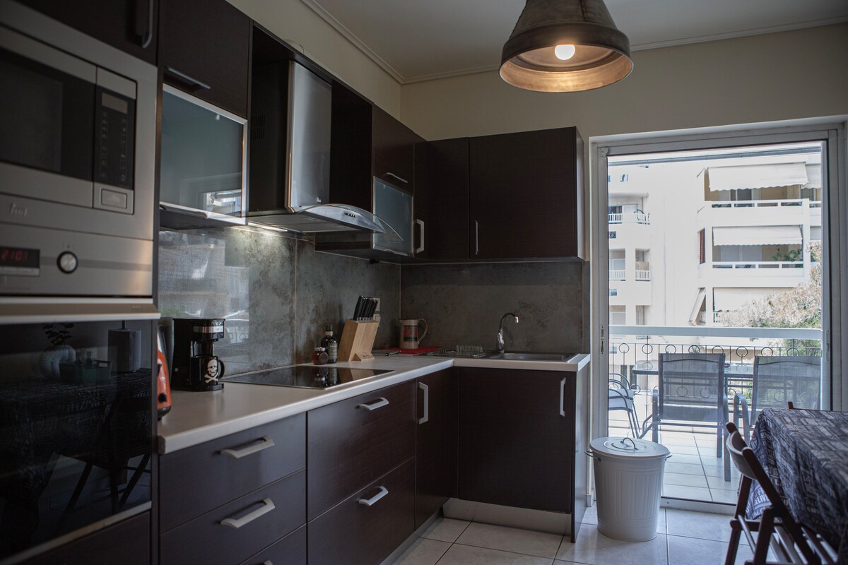 Our 85 sqm stylish and spacious apartment can accommodate 3 people. It consists of a bedroom with a king size bed, a living room that sleeps one in a sofa, a dining room, a fully equipped kitchen and bathroom and an entrance hall with a couch.The residence is perfectly located in a central, safe and quite area. It is within 5' walking distance to"EVANGELISMOS" Metro station which connects you directly to the airport