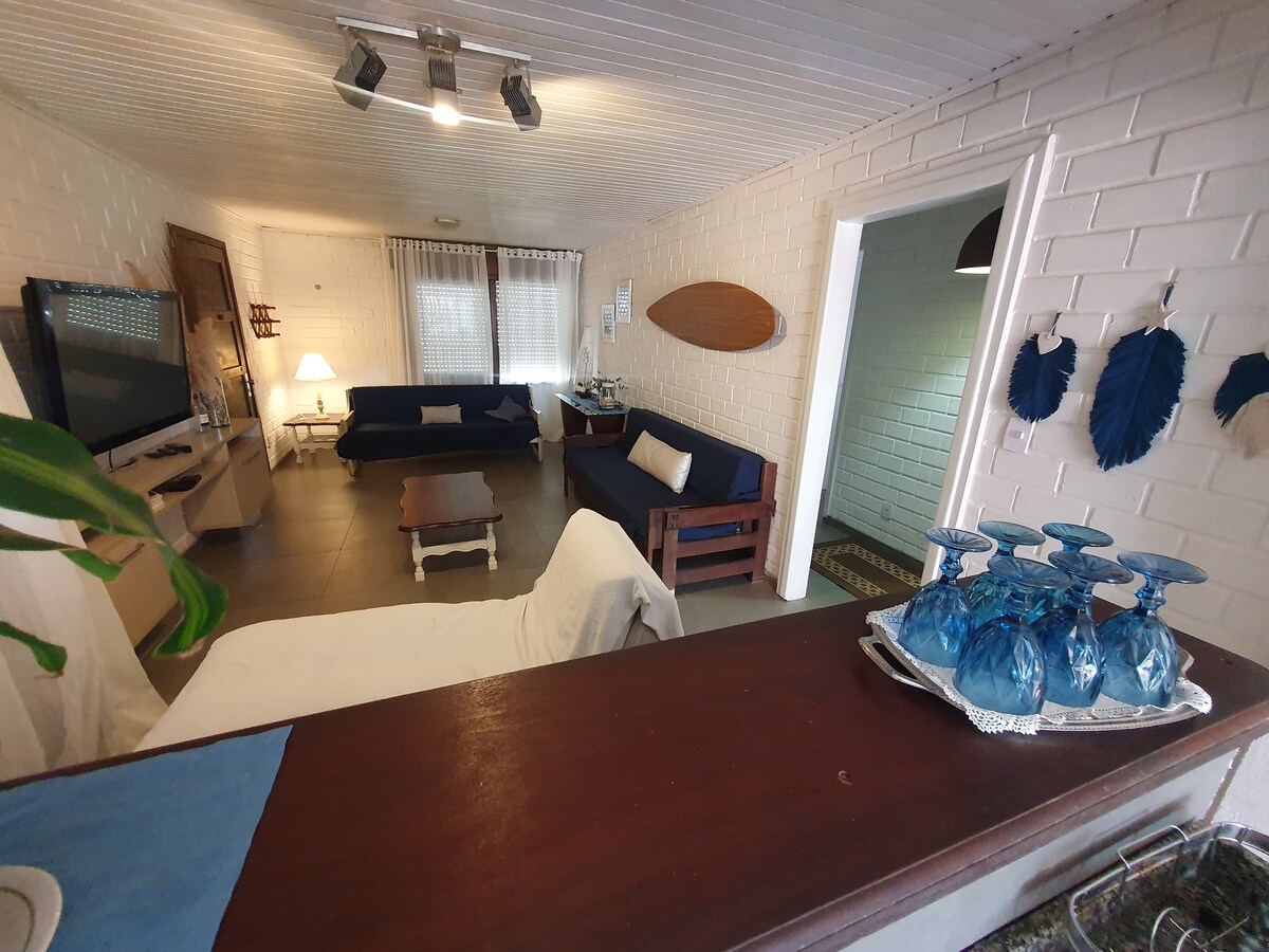Casa completa, 2 quartos, suíte, internet, ar condicionado. Próxima à praia, com piscina, lareira, sala ampla com ótima ventilação.