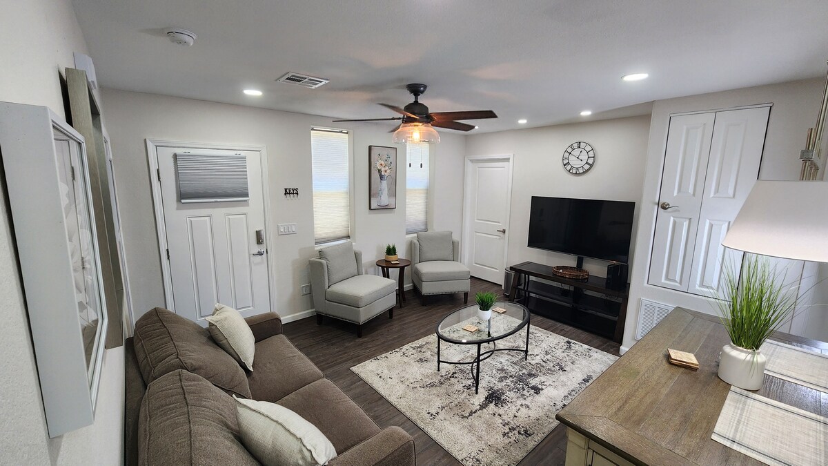 Bright, fully separate guesthouse in the back of a home with a separate entrance, ideal for two. Clean, modern, and thoughtfully equipped, this space offers privacy and comfort with in-unit washer and dryer, air conditioning, and a kitchenette. Easy access to local essentials—5 minutes to Onvida Hospital and Sprouts, and just minutes from coffee shops, restaurants, and neighborhood shops.