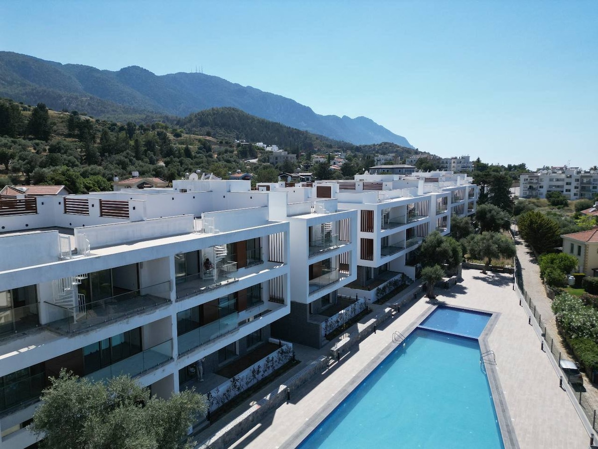 Fully furnished one-bedroom apartment in a newly built gated community with breathtaking views of the mountains and sea. Within walking distance to some of Kyrenia's most beautiful beaches. Situated in Alsancak, an unspoilt, beautiful Cypriot village on the slopes of the Kyrenia mountains and with the Mediterranean Sea in the backdrop. The grounds include a restaurant serving tasty local/western dishes, a large swimming pool, jacuzzi and a number of courtyards with beautifully tended gardens.