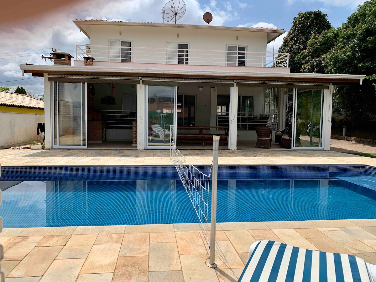 Bandeirantesdən Km 59-un çıxışında San-Pauludan 50 dəqiqəlik məsafədə hovuzu və buxarısı olan rahat kottec. 9 nəfərlik qonaqlama yeri, 5 yataq otağı, 3 geniş otaq, üzgüçülük hovuzu, barbekü sahəsi, divan və qamakları olan böyük balkon, bağça və gözəl palmalar. Yataq və qonaq otağında 200 MG və Smart TV. Soba, elektrik sobası, mikrodalğalı soba, 4 hamam otağı olan mətbəx. 3 yataq otağında və qonaq otağında kondisioner. Bura qapalı icmanın daxilində sakit bir xiyabandadır.