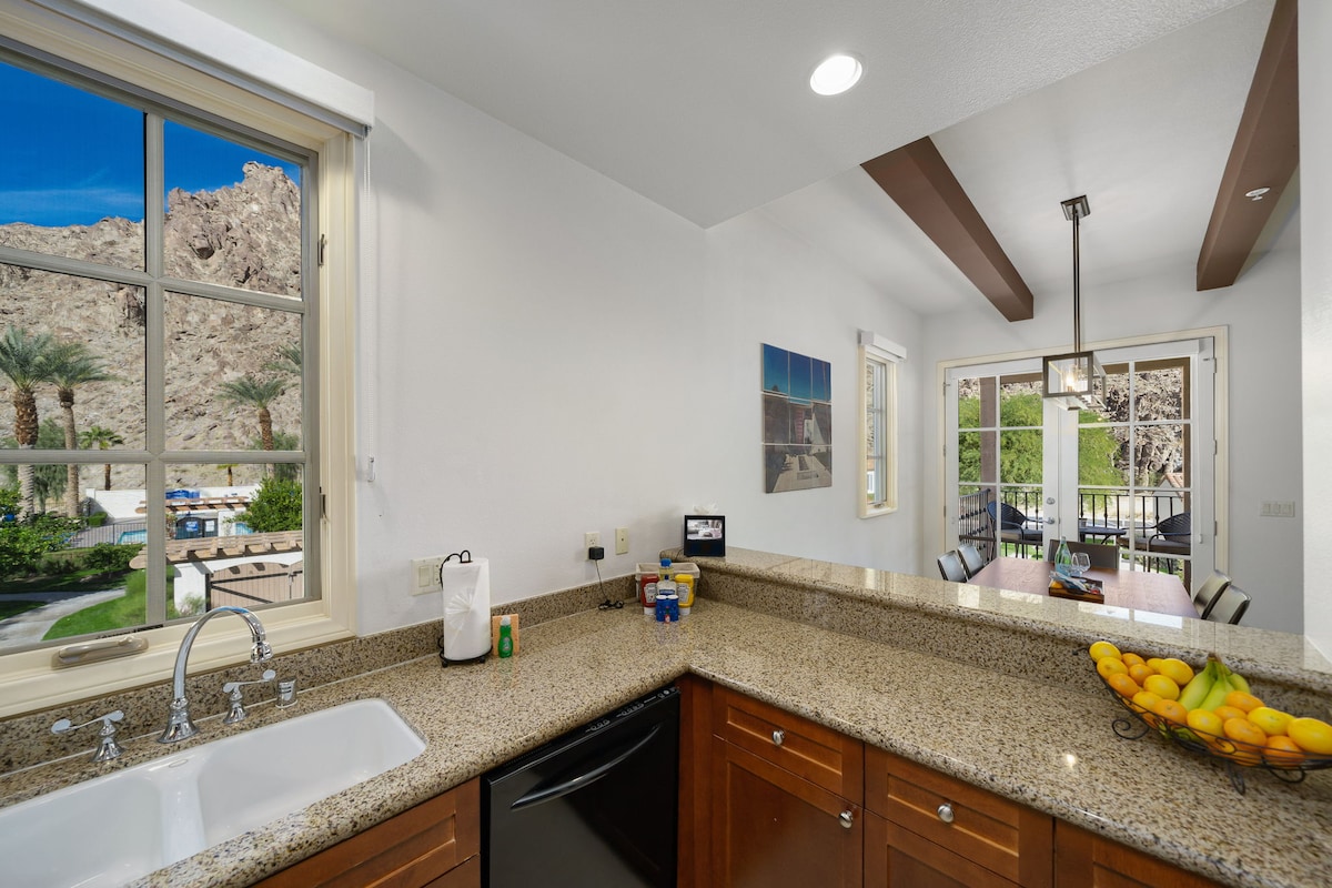 The Legacy Palms is a newly renovated, spacious & bright 2 bedroom, 2 bath condo with a modern California-desert vibe. French doors open to a large private balcony with dining and sitting area, overlooking the lush villa grounds & water fountains. It features a full kitchen with new stainless steel appliances, 3 smart TV's, dining area, 2 fireplaces and pull out queen sleeper couch in the living area. The community grounds feature 12 heated pools and spas, a gym, hammocks, grills and more!
