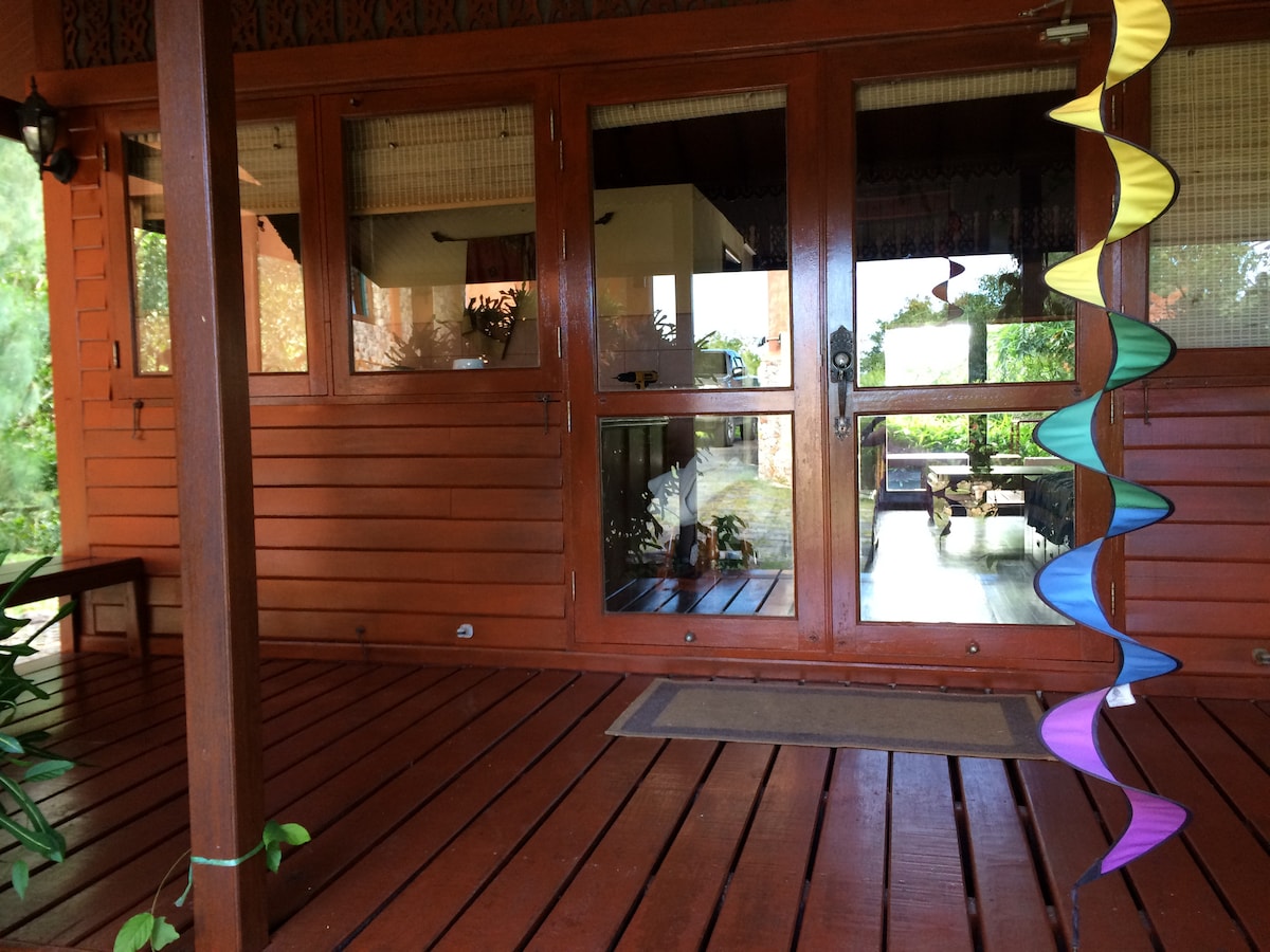 Sakit, qurulmuş icma arasında bu füsunkar 36 kv mt-lik taxta evi tapa bilərsiniz. Təbiətin səslərinə oyanın və yetkin ağacları və bitki örtüyü ilə bağ mənzərəsindən zövq alın. Öz şəxsi görünüşünüzdən günəş vannalarından zövq alın. Tavan pərəstişkarları yalnız ilin çox hissəsində təpədə AC lazım deyil. 20 dəqiqəlik məsafədə sizi sakit, turistik olmayan çimərliyə aparır. Sahiblər qonşu əmlakda yaşayır, lakin məxfiliyiniz təmin edilir. Avtomobil və ya motosikletə ehtiyac var. Tək qadınlar, cütlüklər və ya LGBTQ+ xoş gəlmisiniz.