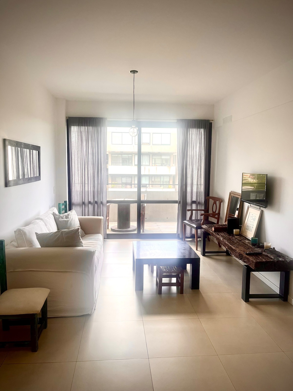 El departamento tiene dos ambientes con cochera descubierta en el edificio. Es acogedor y tranquilo, con grandes ventanales que llenan de luz y verde. En el living hay un smart tv de 42’ y conexión wifi. La cocina está bien equipada. El dormitorio es amplio, con cama doble y placard en el pasillo, el baño tiene bañera. El balcón arreglado con plantas y una pequeña mesa con sillas invitan a relajarse tomando un bebida. Sábanas y toallas. La Pileta tiene deck con reposeras , es de uso común.
