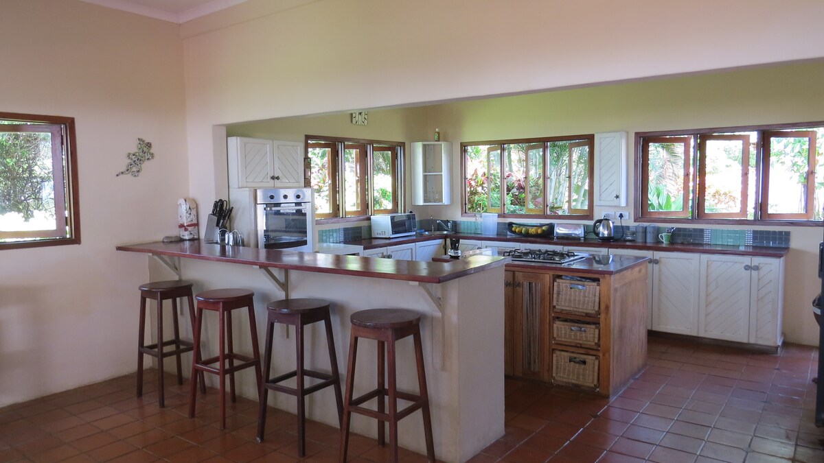 You'll have a great time in this calm, coloured, comfortable & modern house. Sleep & wake up to the sounds of waves and bird songs. Have an enjoyable sea view lying on the bed in the master bedroom. Have a pleasant Bazaruto Island view from the 3200 Square Meters backyard. This type 2 house with a straw roofing is fully furnished & equipped, including aircons in all compartments, bed linen, towels, sofas, TV, refrigerator, stove, microwave, toaster, electric kettle, kitchen utensils. Enjoy!