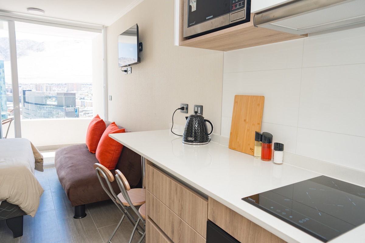 Ailələr, cütlüklər və ya işgüzar səfərlər üçün ideal olan Iquique-dəki bu rahat mənzildə rahat qonaqlamadan zövq alın. Qonaqlama yerində 2 yataq otağı, 1 hamam otağı, təchiz olunmuş mətbəx, Ağıllı TV və terraslı qonaq otağı var. Plaza Prat, Paseo Baquedano, Zofri və Museo Corbeta Esmeralda-ya giriş. Mövqe həm sahil kənarı, həm də şəhərin kommersiya və mədəni ərazisindən zövq almağınıza imkan verəcək. - Pulsuz Wi-Fi -İcazəli mətbəx -Conserjería 24 filiz -Özəl parkinq