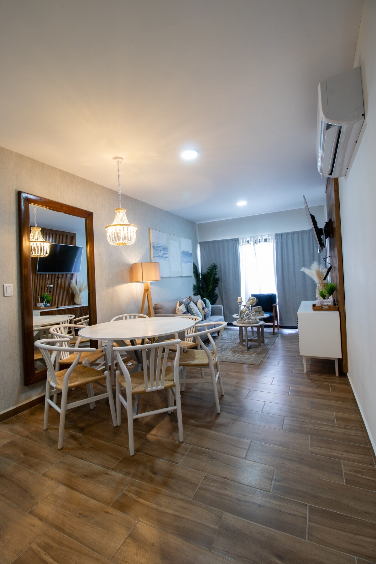 Çimərlikdən 200 metr məsafədə, 5 dəqiqəlik məsafədə yerləşən mənzil, səbətinizə ehtiyacınız yoxdur. Mənzil 1-ci mərtəbədədir və aşağıdakılara malikdir: Kraliça Ölçüsü çarpayısı olan -Recamara Prinsipi - İkimərtəbəli çarpayısı olan ikinci dərəcəliRecamara -1 vanna otağı və 1/2 -İcazəli mətbəx -Şərəb və yemək otağı -Smart TV qonaq otağında -Wi-Fi - Hovuz mənzərəli baron - Okean mənzərəli terras İmkanlar: - hovuz -Palapas qaz qrili ilə -Vikllər -Fitnes sahəsi -Mini Qolf -Oyun Uşaqları - Voleybol meydançası -kontrollu giriş