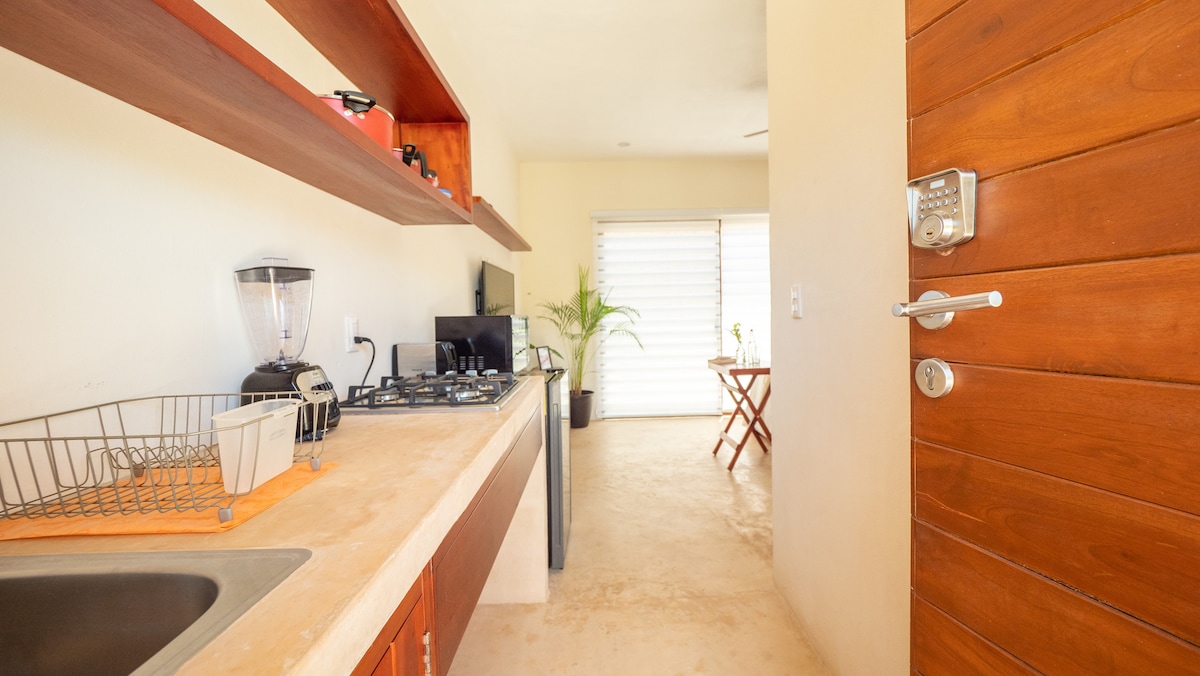 30 meters full of light will be part of your history in Holbox. The suite is located on the first floor of Shankara; It is an intimate and very personal space to recharge energy. The best Wifi on the Island. It has a King Size bed, its sheets, a 49-inch TV; a bathroom equipped with a shower, toiletries and towels; a spacious closet, and everything you need when you decide to cook from home: refrigerator, grill, coffee maker, blender, toaster, microwave and utensils.