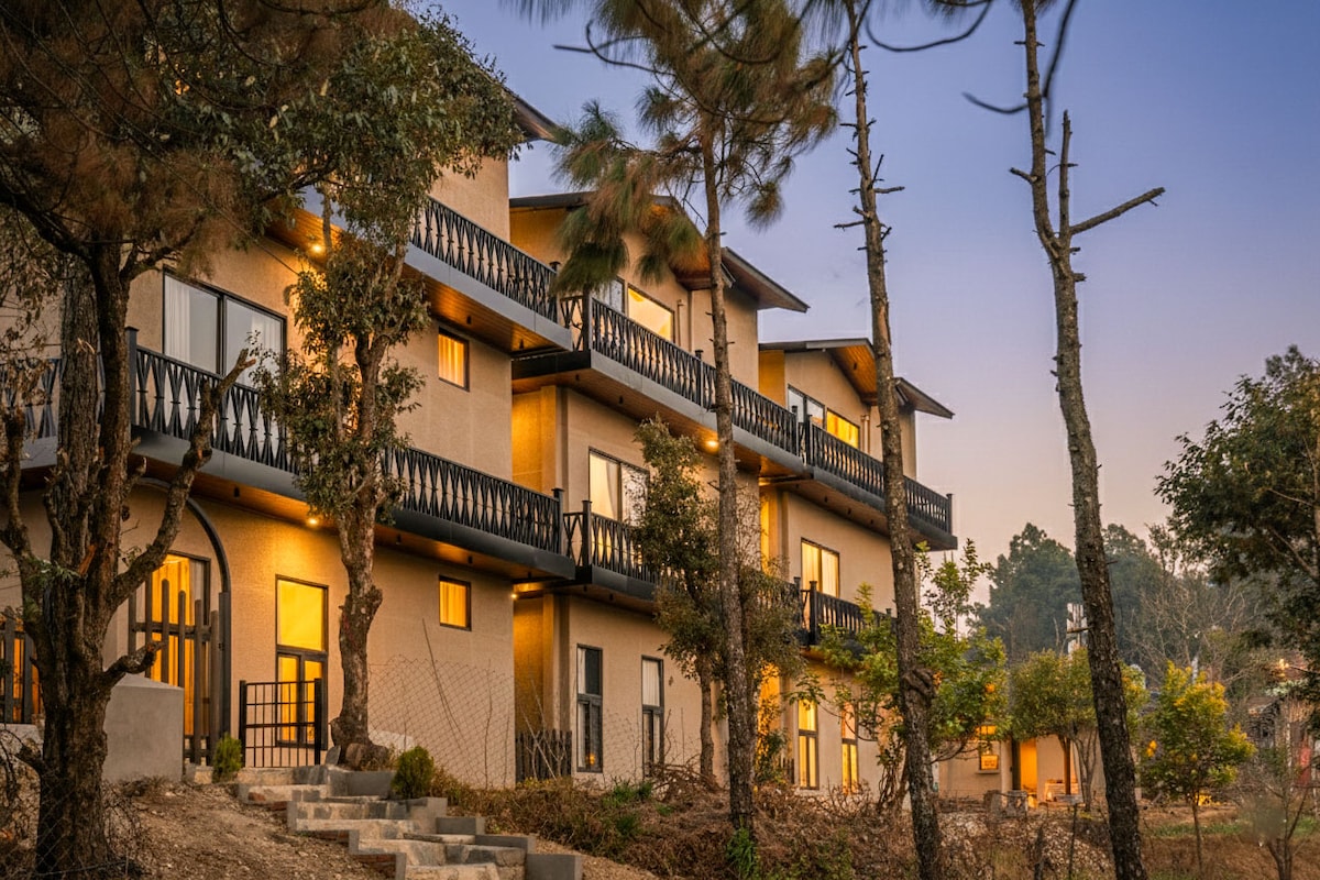Encompassed by towering pine trees in Uttarakhand's chilly yet cozy climate; an escape from the mundane and busy city life this tranquil property awaits you. Enjoy the serene view while strolling in the gardens or sit back to watch the warm sun set for the day from the front yard. Our pet-friendly set of 9 villas are undoubtedly a delight for everyone to experience an offbeat getaway. The property promises to leave you with an unforgettable experience, only to come back once again.