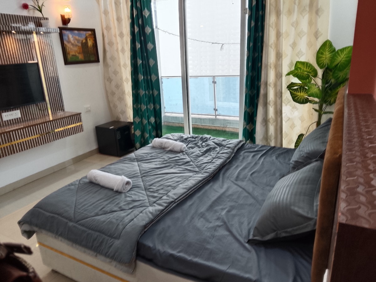 Welcome to your luxury escape in the city — a beautifully curated studio apartment that’s perfect for couples, small families, or business travellers located at Fusion Ufairia, Ek Murti Chowk, Noida Extension - Sleeps up to 3 guests comfortably - Fully loaded kitchen with cooking essentials, microwave & induction. - Modern bathroom & soft towels - Smart TV, fast WiFi, and ambient lighting for Netflix nights - Air-conditioned - Free street parking - Spotlessly clean