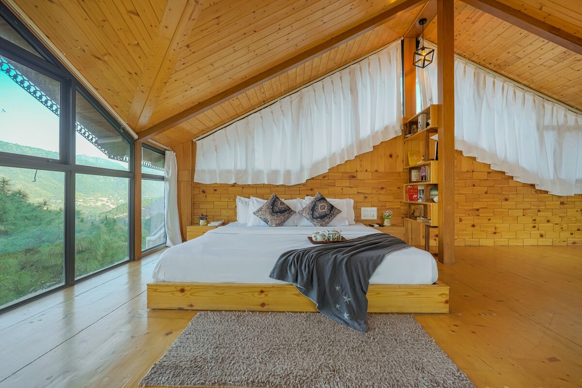 Welcome to Pine Noir Cabin, a unique A-frame retreat by Nowhere Cottages in Kasauli. This luxurious cabin features a stunning blend of pine ceiling paneling and exposed iron elements painted in matte black Duco, creating a chic all-black interior. Surrounded by a dense pine forest with breathtaking valley views, it offers an unparalleled escape. Discover tranquility and elegance in Kasauli's first of it’s kind A-frame cabin, perfect for a serene getaway or an adventurous retreat.