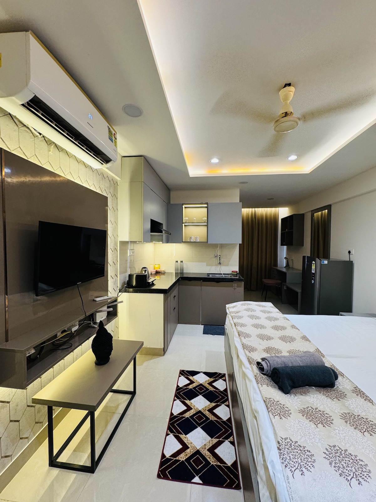 Welcome to your premium luxury studio in Jaipur, designed for comfort, style, and privacy. Perfect for couples, business travelers, and short stays, it features a cozy king bed, warm lighting, Smart TV, high-speed WiFi, workspace, and a fully equipped kitchen. Enjoy self check-in and a safe, peaceful environment. Located near WTP and the airport, with easy access to cafes and markets. Book now for a comfortable stay.