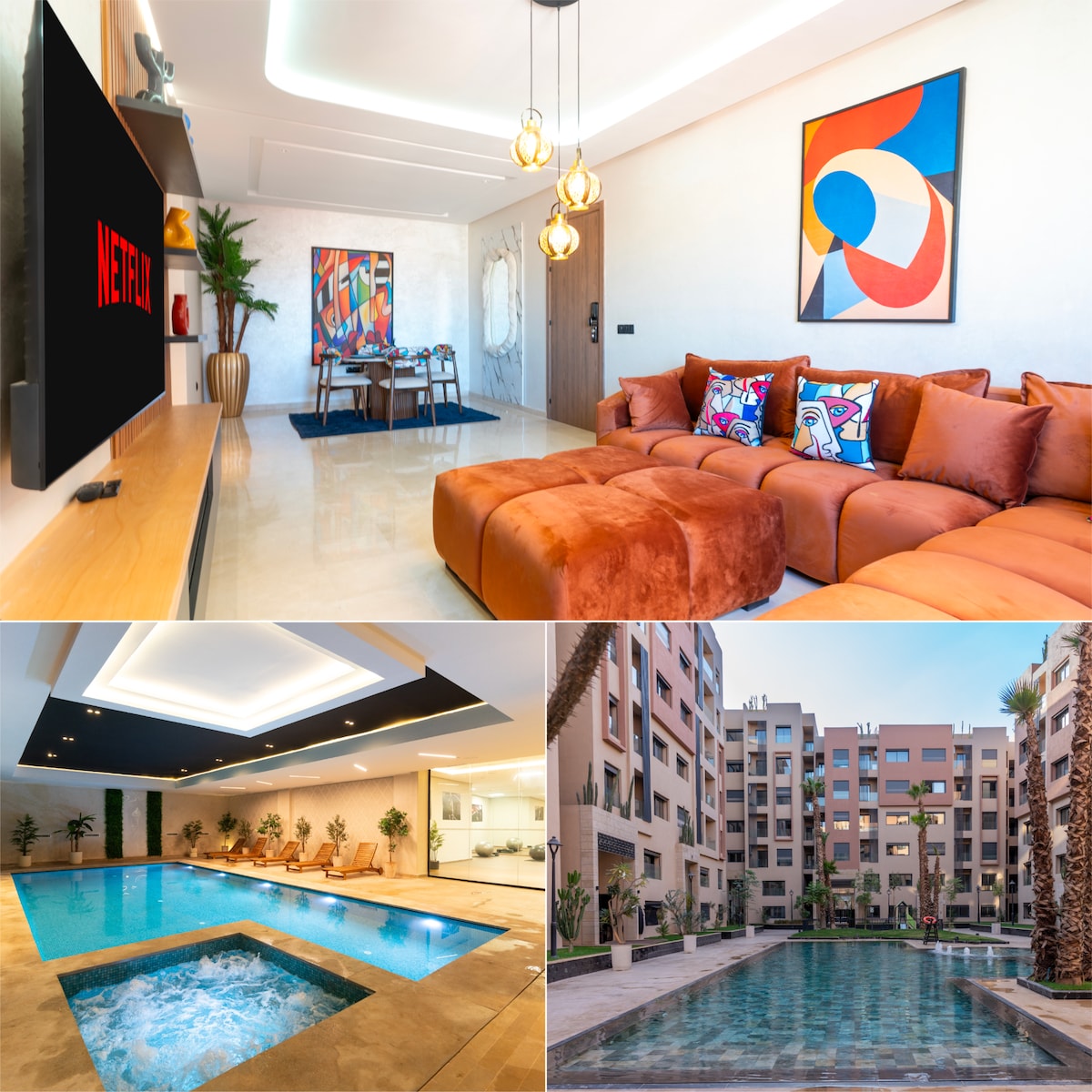 Welcome to our thoughtfully designed one-bedroom apartment with pool, where positive energy flows through every inch. in the center of Gueliz 10 min walk from carré Eden and the 5 minutes from the train station. Perfectly situated, you'll be surrounded by an array of restaurants, cafes, and shops. Well Equipped, we've taken care of every detail, high-speed internet, IP TV, Netflix, ensuring a seamless experience and make your stay stress-free