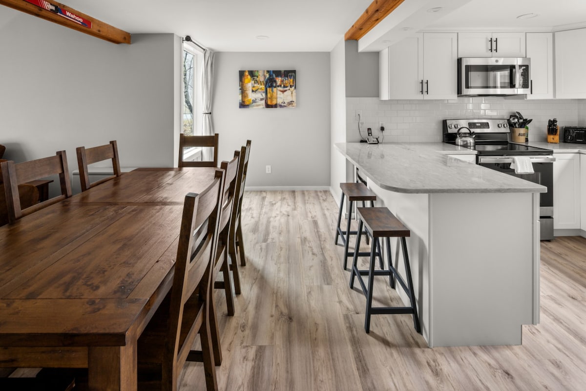 Stowe-da ən yaxşı yerlərdən biri olan bu yeni elanda rahat olun. Çayın yanında yerləşən, şəhərin mərkəzinə və Stowe barlarına və restoranlara addımlayırsınız. Dağ servisini xizək kurortuna qədər tutun. Şəhərdən keçərək Rec yoluna velosiped sürün. Propan buxarı yanında böyük ölçülü divanda istirahət edin. Sonos dinamiklərini dinləyərkən, bir kitabla məxmər sevimlilərdə uzanın. Yeni mətbəxdə əyləşin/4K televizora baxın və ya arxa verandada qril edərkən aşağıda çayın qamışlığını dinləyin.