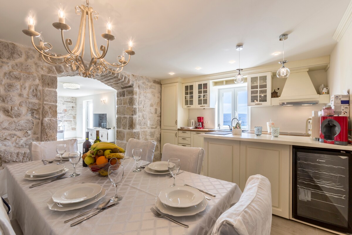 Splitin cəmi 15 km cənubunda və Omişdən 5 km məsafədə, Sumpetarda yerləşən 280 m²-lik geniş lüks mənzilimizdə qonaqlamanızdan zövq alın. Kristal təmizlikdə dənizdən cəmi 100 metr məsafədə yerləşən bu tam yeni premium qonaqlama yeri otel lüksü ilə ev rahatlığının mükəmməl balansını təklif edir. Mənzildə gözəl dizayn edilmiş dörd yataq otağı var. Hər birində saç feni, kondisioner və televizor olan ayrıca hamam-tualet var. Qısa bir gəzinti ilə yerli çimərlik barlarına, restoranlara və bazarlara çata bilərsiniz.
