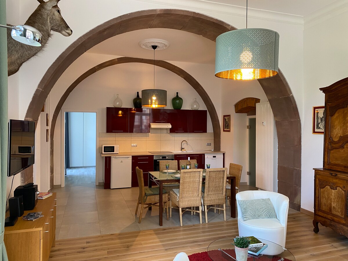 müasir və köhnəni birləşdirən çox müasir dekorasiya ilə təchiz olunmuş 75 m2-lik mənzil. 4 nəfərə qədər qonaq qəbul edə bilərik bu qonaqlama ailə və ya kiçik qrupu,eləcə də işgüzar səfərlərdə olan insanları yerləşdirmək üçün idealdır almaniya yaxınlığında şərab marşrutunun başlanğıcına yaxın, Strasburqda yerləşən 25 klm məsafədə yerləşən avtobus dayanacağı yaxınlığında çox sakit bir restoranın üstündə qəhvə choclat çayı , səhər yeməyi üçün diposition