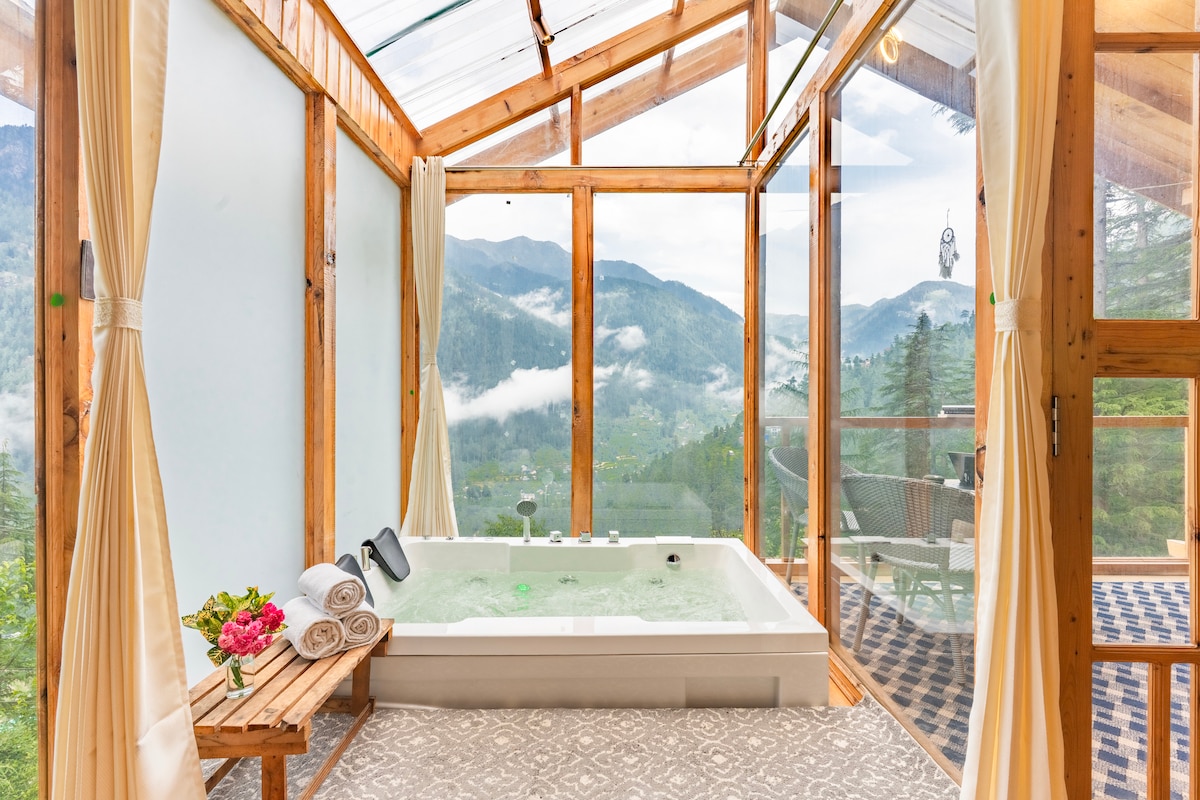 İSTİ CAKUZİ + PULSUZ SƏHƏR YEMƏYİ + PULSUZ İSİTİCİ + UZUNMÜDDƏTLİ QONAQLAMALAR ÜÇÜN PULSUZ XOROVUZ + DAĞLARDA İŞ ÜÇÜN MÜKƏMMƏL OLAN İNVERTER ELEKTRİK TƏCHİZATI VƏ WI-Fİ ilə Skyheaven Jacuzzi Treehouse (Cibi) Hindistanın Treehouse Village ərazisində lüks şəxsi istirahət məkanıdır. Meşələr, vadilər və alma bağları ilə əhatə olunmuş, dağ mənzərəli eyvanın, sənətkarlıqla hazırlanmış interyerin, geniş hamamın təəssüratından zövq alın. Cütlüklər, ailələr və tək səyahətçilər üçün idealdır. "Vaxtın həqiqətən yavaşladığı, xəyalpərəst, dinc və büdcə yönümlü bir istirahət"