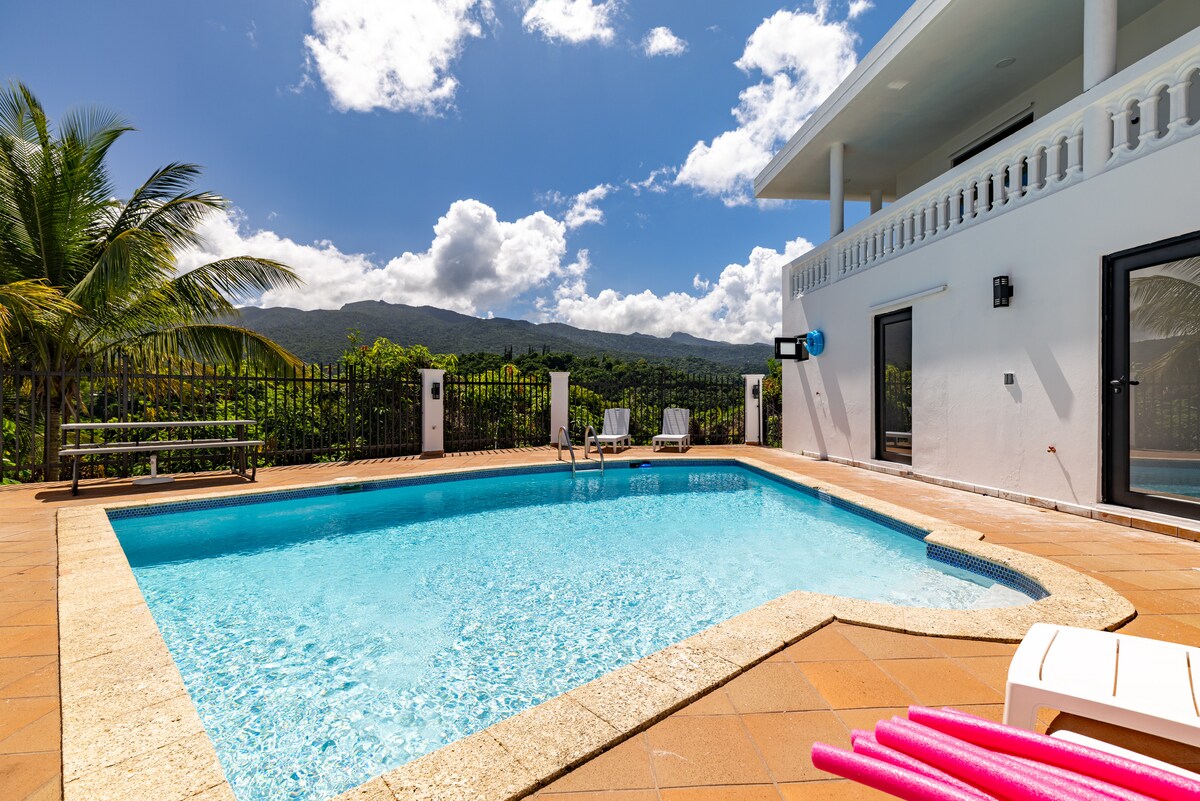 House is surrounded by acres of tropical rainforest, yet only 1 mile from PR3. Ocean & Mountain Views. 10'x20' salt water pool just steps from your front door. Pool is not shared with anyone else. King Master Bedroom Suite Gated property, gated pool. Large patio with grill and plenty of seatjng. Concrete house: safe, secure, sound proof. Full solar/no blackouts! Families & Kids Welcome! Luquillo Beach, El Yunque, Carabali Park within 5 miles!! 20 miles from SJU. 2nd Floor occupied by Host