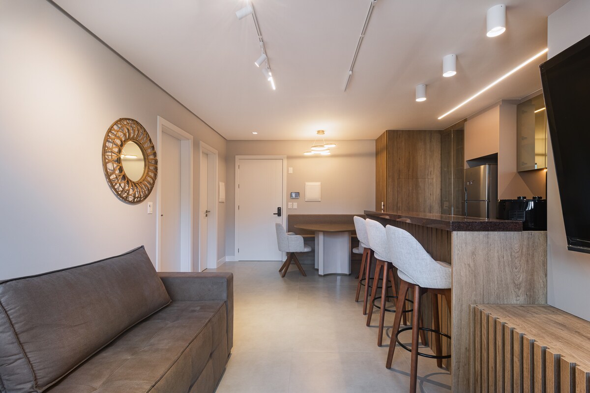 Espaço moderno no Residencial Vésta, a apenas 400 m da praia, acima do Shopping Vésta e da charmosa Praça Getúlio Vargas. • Toalhas e jogo completo de lençóis • Wi-Fi de 500 Mbps • SmartTV, ar-condicionado quente e frio, cozinha completa, churrasqueira • Máquina de café espresso (LOV, 3 Corações) • Estacionamento coberto incluso • Piscina Um espaço ideal para casal. Conforto e muita segurança em um ambiente intimista, com fácil acesso às belezas de Torres.