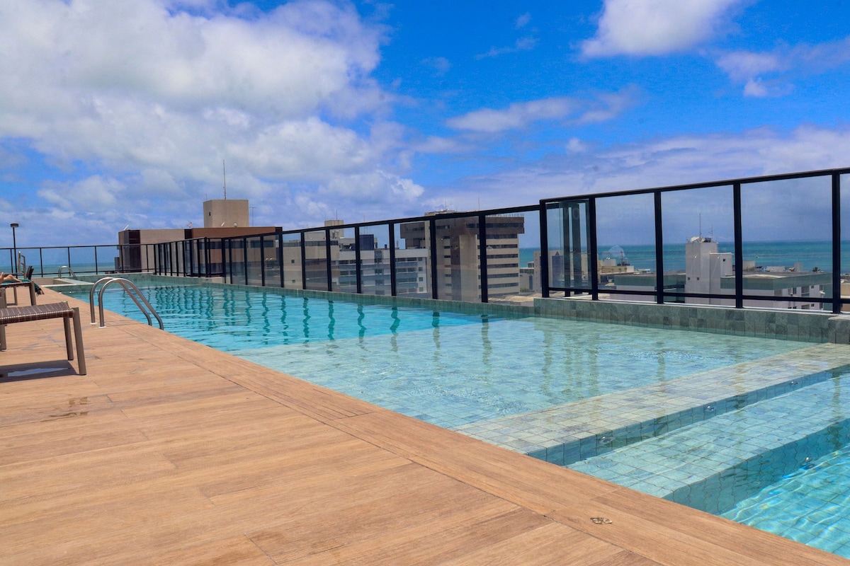 Tambaú Beach-də, əla yerdə, 2 mühit üçün gözəl qonaq otağı, 1 süitası, sosial vanna otağı, tam mətbəxi və tam təchiz olunmuş 2 rahat otağı olan bu gözəl mənzildə qonaqlayın. Gözəl və dəbdəbəli ətrafı, dənizə və şəhərə gözəl mənzərəsi olan damüstü hovuzu olan bina. İNDİ GÜNLƏRİNİZİ REZERVASİYA EDİN.