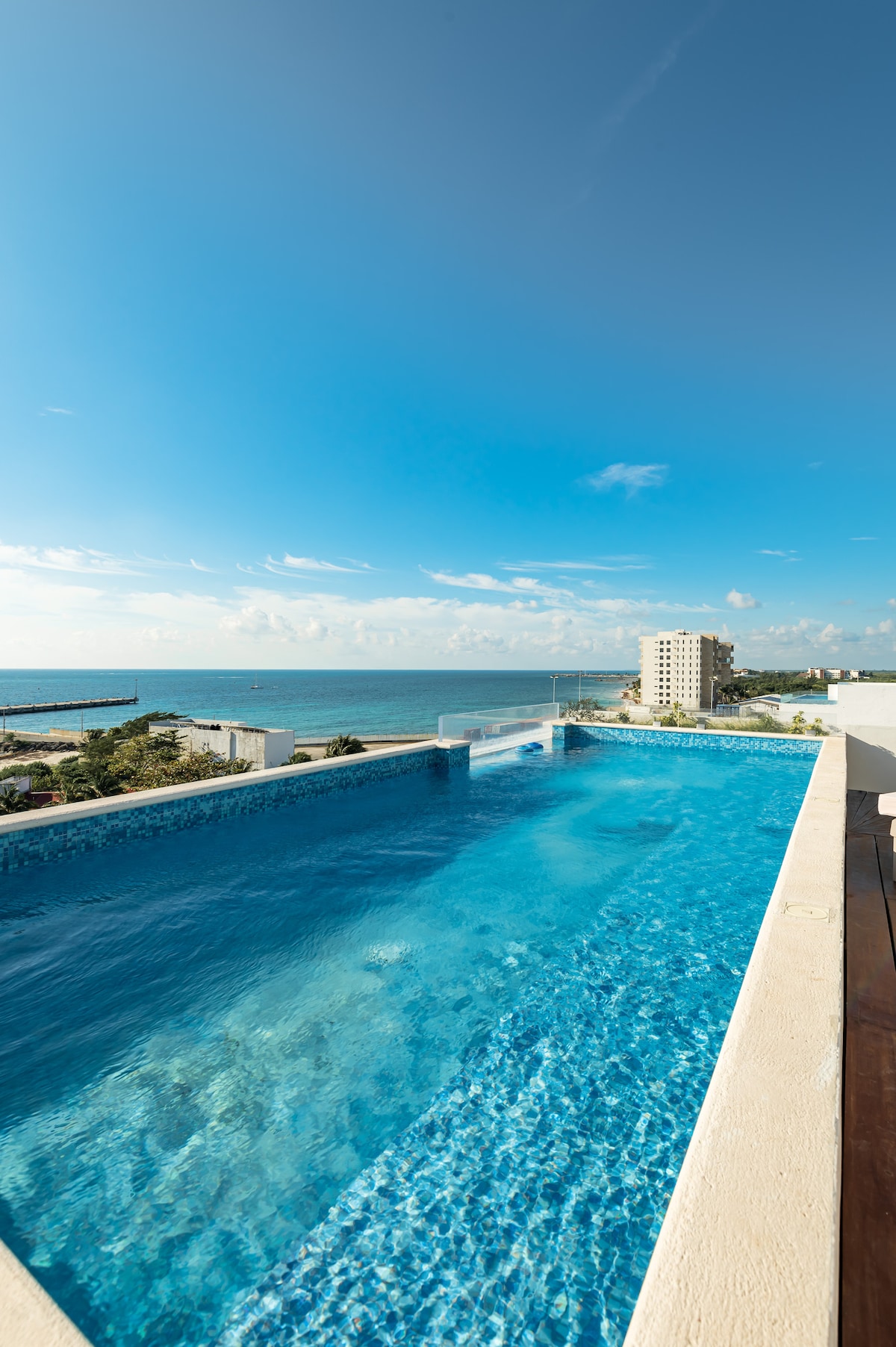 Estudio en edificio frente al mar en Puerto Morelos, dentro del exclusivo Distrito Puerto. Disfruta de acceso directo a la playa, alberca en el rooftop con vista al Caribe, gimnasio con vista al mar, wifi de alta velocidad y seguridad 24/7. Ideal para parejas o viajeros que buscan tranquilidad, confort y conexión con el mar a pocos minutos en taxi del centro de Puerto Morelos. *Te recomendamos moverte en taxi, ya que el edificio no cuenta con estacionamiento disponible