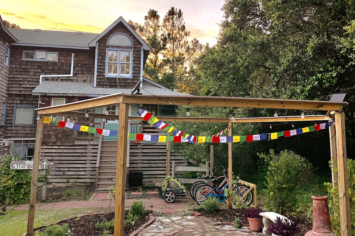 Dəniz meşəsində, Nags Head Woods Nature Conservancy-nin yanındakı təpədə yerləşən, fərdi tikilmiş evin birinci mərtəbəsində yerləşən rahat mənzil. * Çimərliyə 1 mil məsafədə * Hamam otağı olan 1 BR * Mətbəx (induksiya odluğu, tavalar, mikrodalğalı soba, Keurig, elektrik çaydan, French Press) * Qonaq otağı sahəsi w/ 50" Ağıllı TV (Netflix & Hulu) * Ayrıca Əhatə Olunan Veranda * Wi-Fi * Açıq Duş (paylaşılan) * 2 Çimərlikyanı Stul * 2 Çimərlik Kruizeri Motosikleti * Qaz Yanğını Piti * Qaz Qril * Gəzinti yolları