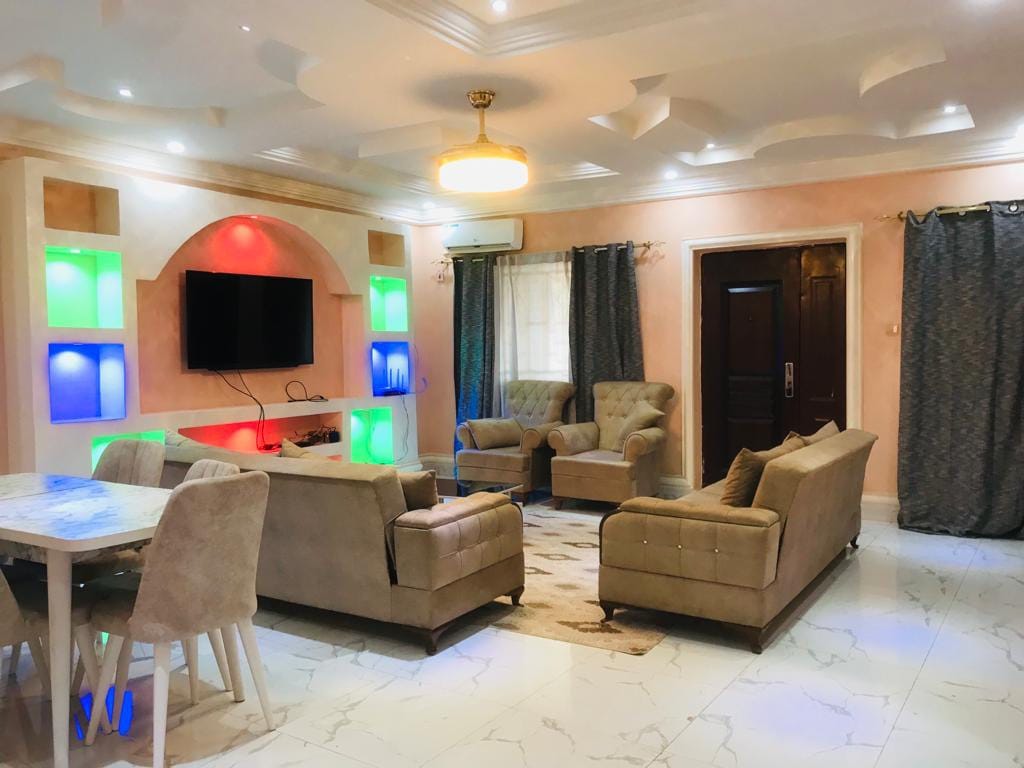 Forget your worries in this spacious and serene space. Tastefully decorated and fully furnished modern 3 bed house with scenic mountains views Perfect for: Remote workers, expats, travelers, and business visitors. Wi-Fi Guest Toilet AC Utensils Solar power Spacious parking Security guard CCTV Electricity Please note that Havillah Court is located the top of a steep hill but is accessible via a paved road from the main highway. You need a good car that can climb hills.