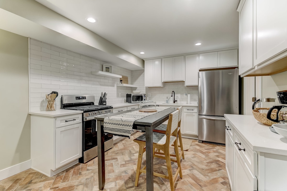 Welcome to your creative one bedroom, one bath retreat in Reservoir Hill, designed for peaceful getaways, staycations, or work trips. This art filled space blends historic charm with modern comfort and features multiple standing and seated workstations. Enjoy a functional bedroom with a Murphy bed for added space, a fully stocked kitchen, formal dining area, bar cart with vinyl player, balcony views, and thoughtful details throughout, perfect for rest, creativity, and photo worthy moments.