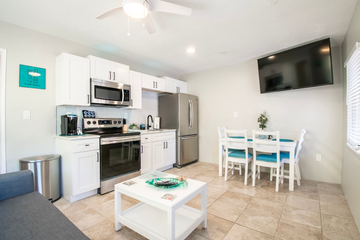 Our cozy Bungalow is for 2 to 4 ppl, and provides you with everything you need to enjoy your visit. In the bedroom is a King size bed and a spa styled bathroom. The living space has a sofa that converts into a queen size bed and a 55” Smart HDTV. The kitchen is fully equipped with new SS appliances, a Keriug coffee maker and comp. coffee. This unit has a personal patio for relaxing and is located in the heart of John’s Pass, steps from the boardwalk/village and a short walk to the beach.