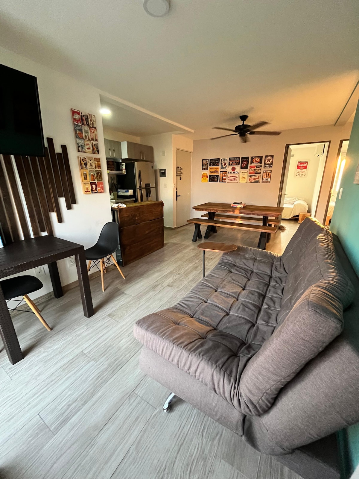 ¡Hola! El departamento tiene un segundo piso en el que está el dormitorio, se conecta a la planta baja mediante una escalera, es ideal para parejas, super fresco todo el año por que es térmico, comparte una alberca muy grande con los demás depas y un área común amplísima con palapas. Ideal para disfrutar de los muchos lugares turísticos a los alrededores y para quedarse a disfrutar de la alberca todo el día.