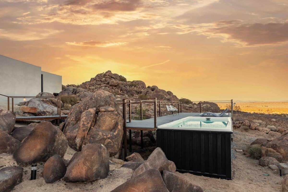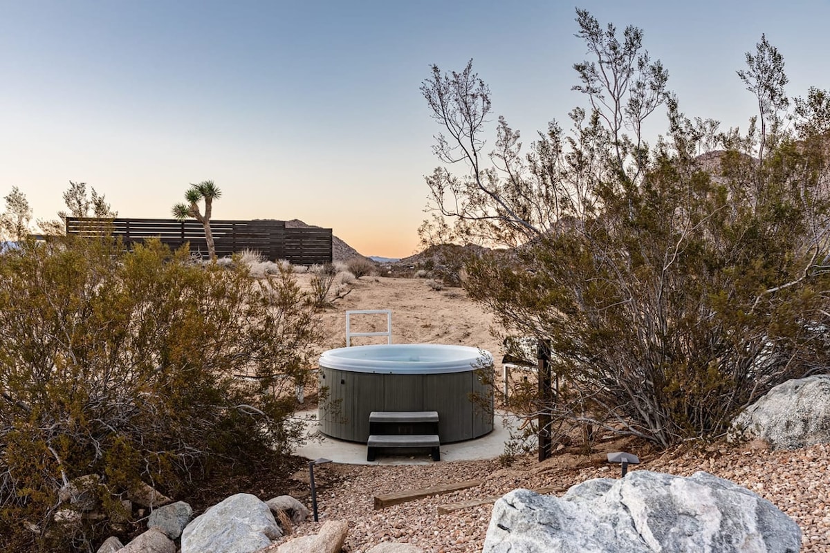 Welcome to Shadow House, located within the serene Solace Retreat - a private 10-acre sanctuary in Joshua Tree. Surrounded by sweeping desert views, Shadow House invites you to embrace outdoor living at its finest. Enjoy peaceful mornings on the deck, afternoons lounging by the built-in hot tub or cowboy tub soaking pool, and evenings by the fire pit under a starlit sky. Whether you seek reflection, connection, or simply the calm of nature, Shadow House offers a truly transformative experience.