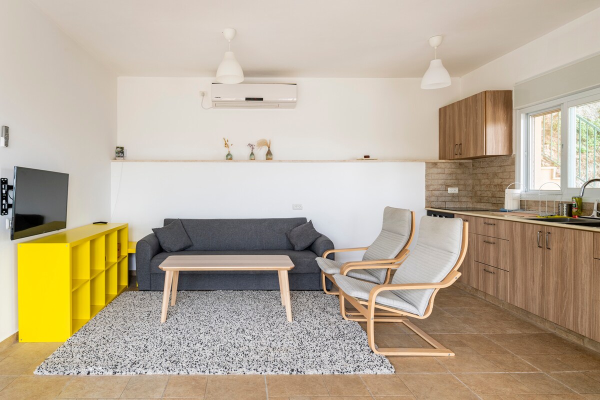 Escape to a stylish desert oasis in Ovnat, a peaceful village nestled amidst the breathtaking landscapes of the Dead Sea. Our two-room unit offers a tranquil retreat for couples or families seeking adventure and relaxation. Immerse yourselves in the stunning views of the Judean Desert cliffs and the Dead Sea from your private patio, complete with a evenings under the stars. Hike to nearby trails, explore the wonders of Ein Gedi or simply unwind in the comfort of our designed space.