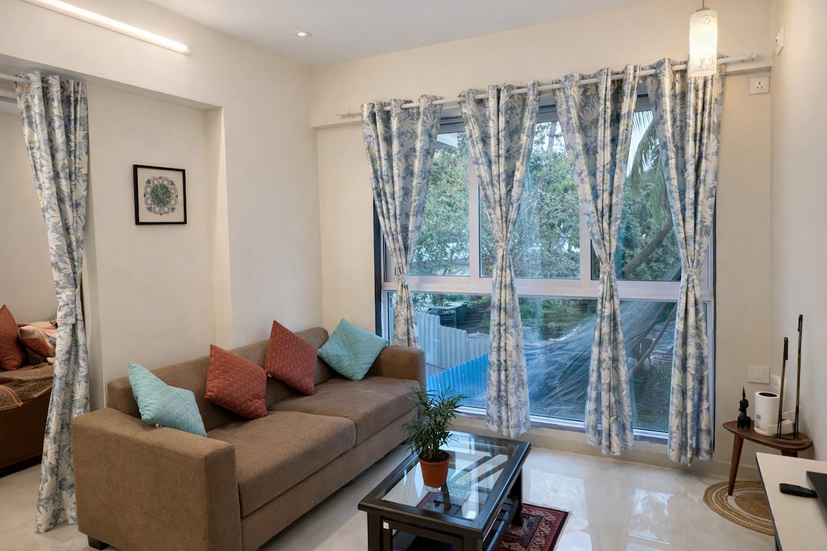 Step into a brand new 1BHK with fresh green interiors and a stylish, cute vibe. Located in a newly built tower, the home features brand new IKEA furniture, a cozy bedroom, modern living space, and two TVs for your entertainment. Centrally located with easy access to the city, the beach is close by, making it ideal for both relaxed getaways and work trips. Bright, comfortable, and thoughtfully designed for a pleasant stay.