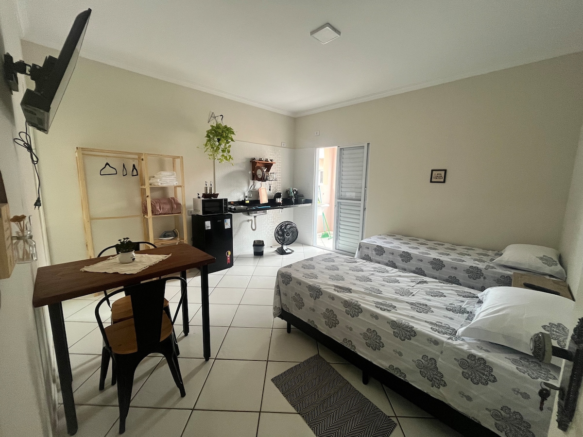 Quer acordar ao som dos pássaros? Então você encontrou o seu lugar! Relaxe depois de um dia cansativo ou aproveite um fim de semana curtindo os restaurantes e vinícolas do circuito das frutas de Jundiaí. Acomoda confortavelmente duas pessoas, mas uma terceira pessoa pode se acomodar no sofá-cama. Trata-se de um pequeno prédio de estúdios (kitnets), com banheiro e cozinha completa exclusivos. As áreas comuns são: estacionamento, hall, escada, corredor e lavanderia. Unidade no piso superior.
