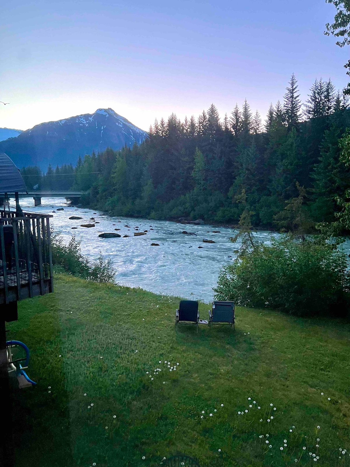 Mendenhall çayındakı yerimizi sevirik! Qartallar, ayılar, marallar, eyvanlar və otlar arxa həyətdə ümumi görməli yerlər, buzlaqla üzlənmiş axının yumşaq qamışlığı isə sakitləşdirici fon təmin edir. Yuxarı Mendenhall Vadisində, Mendenhall Buzlağından cəmi 5 dəqiqəlik məsafədə və demək olar ki, dərhal dərin köhnə meşəyə aparan Qardaşlıq Körpüsü cığırına 3 dəqiqəlik məsafədə yerləşirik. Çay daim dəyişir və həmişə gözəl və rahatdır. Mövcuduq, amma müdaxilə etmirik.