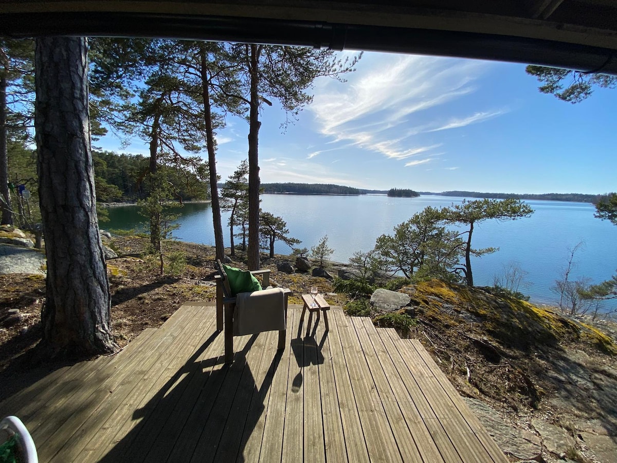 Saaressa rantamökki saunalla. Veneellä rantaan.